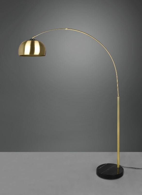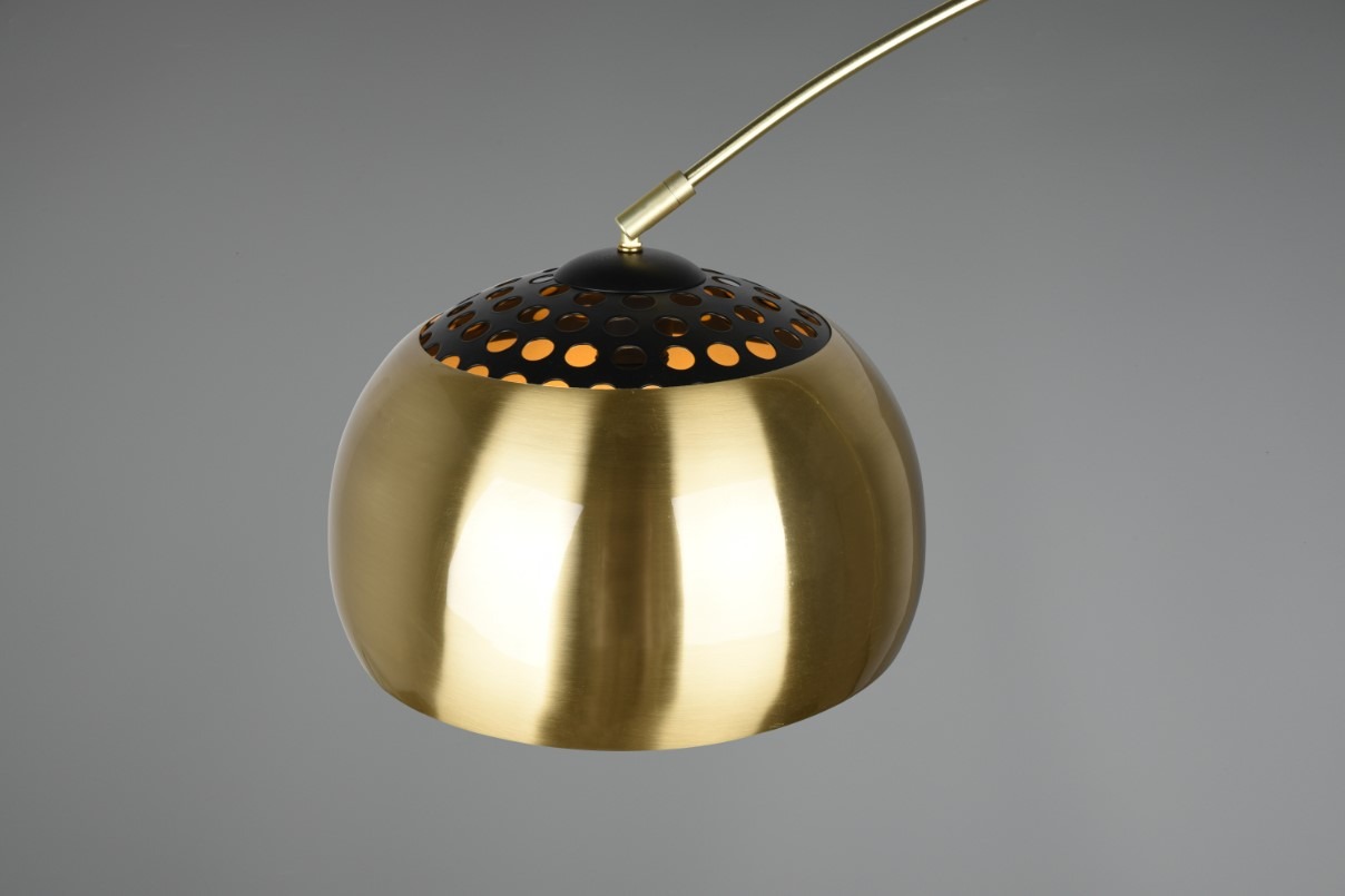 Dankzij het tijdloze ontwerp kan deze elegante booglamp moeiteloos in bestaande woonstijlen geïntegreerd worden. Als leeslamp naast fauteuil of bank. Door de perforaties in de kap schijnt er ook een zacht licht naar boven. Het frame en de kap zijn gemaakt van metaal in messingkleur met een matte afwerking. De zwarte voetplaat is een mooie aanvulling op het ontwerp. De kap heeft een diameter van 33 cm en biedt plaats aan één E27-fitting. De lichtbron mag een maximaal wattage van 60W hebben. De booglamp heeft een voetschakelaar.