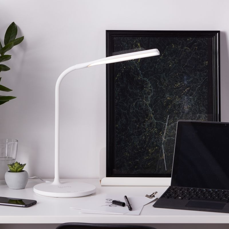 Een mooie bureaulamp uit de collectie van het merk Brilliant met een simplistische moderne look. De lamp is gemaakt van kunststof heeft een compleet witte kleur. De lamp wordt geleverd inclusief geïntegreerde LED lamp met een wattage van 4,5W. Deze lamp kan goed geplaatst worden op een bureau in kantoorruimte of in de woonkamer. De tafellamp heeft een handige touchdimmer waarmee traploos kan worden gedimd. De kleurtemperatuur kan worden aangepast van warm wit naar koel wit. Ook heeft de lamp een geïntegreerde inductieve oplaadfunctie voor de smartphone wat heel praktisch is. De kop kan handig gericht worden en is hierdoor ook goed toepasbaar als leeslamp.