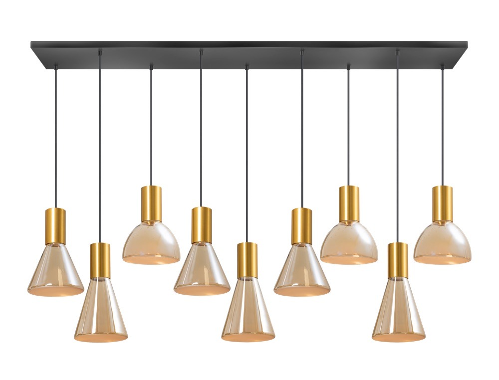 Deze hanglamp van ETH komt uit de Lisa collectie en is een prachtige collectie van lampen in een messing met amberkleurig glas gecombineerd. Leuk om met elkaar te combineren voor één geheel. Deze hanglamp is een echte eyecatcher mede door de kleur en leuke afwisseling van 2 verschillende kapjes. De lamp is tijdens installatie in hoogte te verstellen en hierdoor kan je zelf de pendels op de gewenste hoogte hangen. De lamp heeft 9 pendels met ieder een GU10 fitting geschikt voor een lichtbron van max. 5W. Door zijn lengte is de lamp ideaal geschikt om bijvoorbeeld boven de eettafel te hangen.