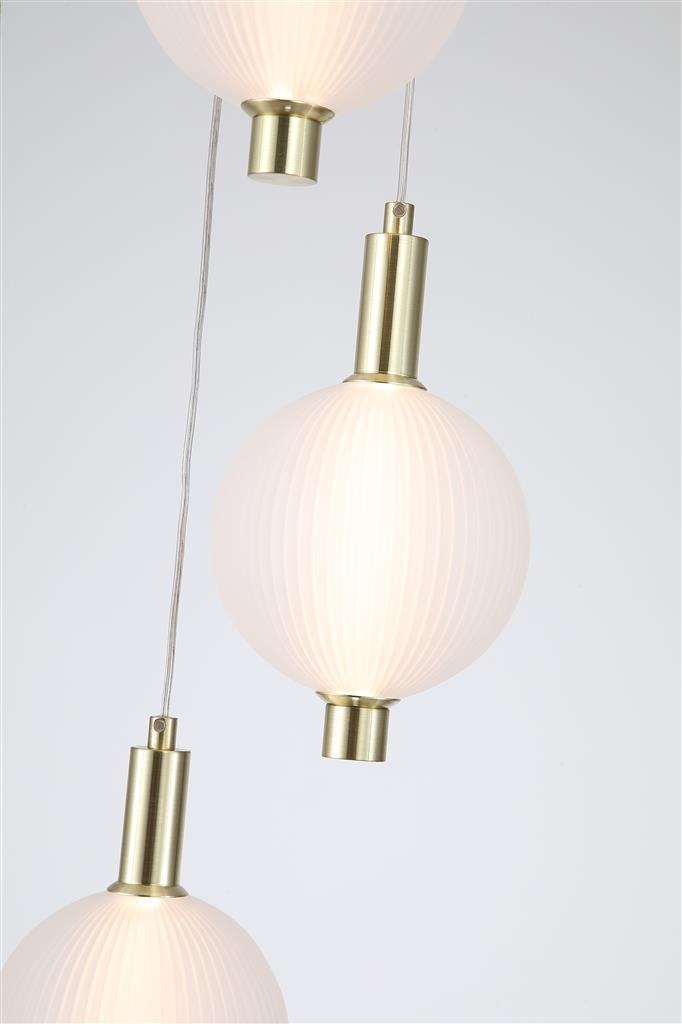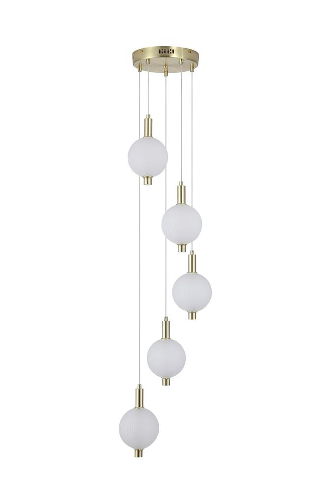 Een prachtige lamp uit de Luminique collectie van het merk Searchlight. Geef je interieur een stijlvolle upgrade met de geribbelde glazen bollen aan een ronde plafondplaat van satijnmessing. De matte glazen kappen verspreiden een warm en gelijkmatig licht zonder te verblinden, terwijl het satijnmessing zorgt voor een luxe uitstraling die past in zowel moderne als klassieke interieurs. Dankzij het ontwerp is deze hanglamp perfect boven de eettafel, in een ruime hal of zelfs in een horeca etablissement. De lamp komt inclusief 5 LED lichtbronnen van 23 watt totaal. Bij installatie is de lamp in hoogte te verstellen tot maximaal 150 cm.