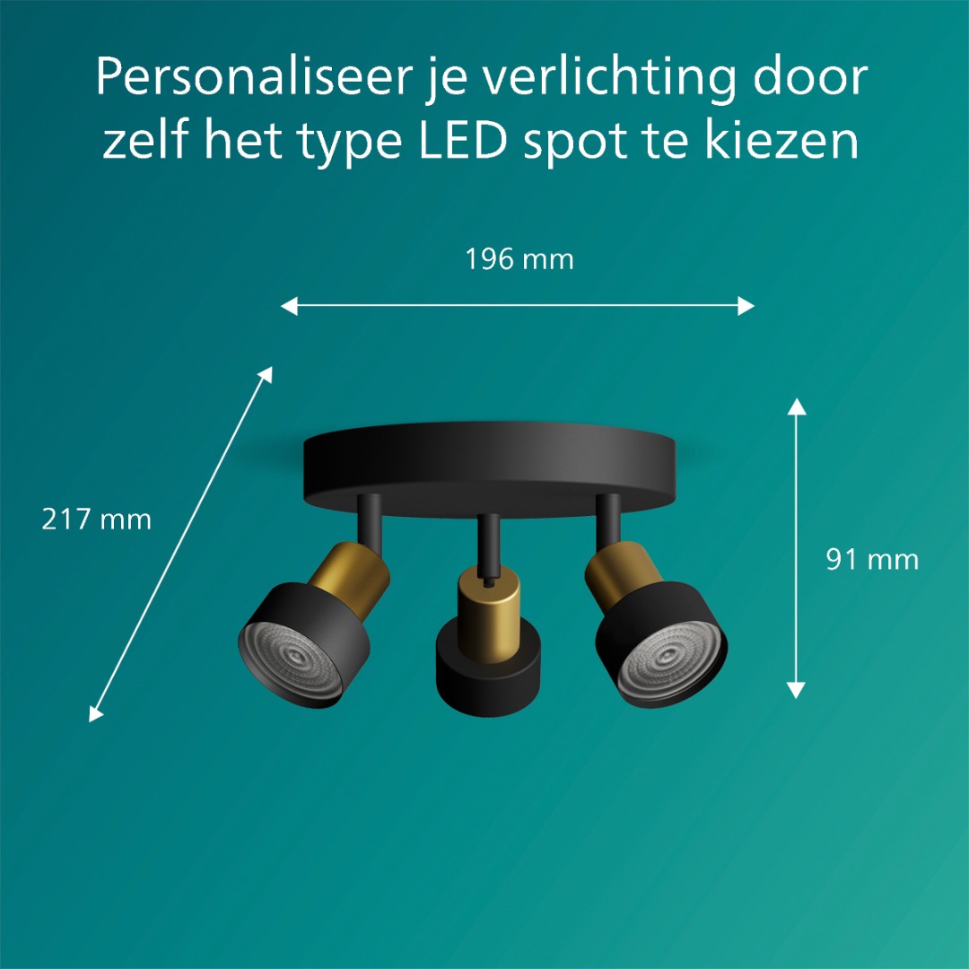 Hoe prachtig is deze Conduit opbouwspot van Philips? De lamp combineert een mooi zwart armatuur, maar gecombineerd met de gouden hals wordt de lamp nog net iets mooier. Erg leuk om te combineren met de andere spots uit de Conduit serie. De spot heeft 3x een GU10 fitting geschikt voor een led lichtbron van ieder max. 5W en deze wordt niet standaard meegeleverd. Spotverlichting is ideaal om in bijvoorbeeld slaap- of woonkamer te plaatsen en kan je vaak in de gewenste richting schijnen om objecten of muren goed uit te lichten en te zorgen voor een mooie lichtverspreiding. Deze Conduit spot is eenvoudig te monteren middels het Philips Click Fix systeem.