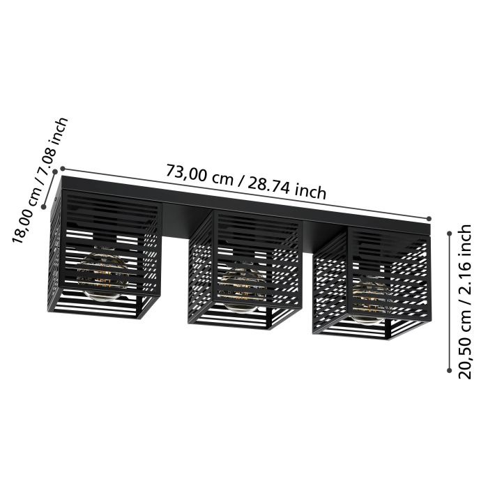 Een mooie plafondlamp uit de collectie van Eglo. De lamp heeft een moderne en industriële uitstraling door het gebruik van het materiaal staal in een compleet zwarte kleur met een soort rooster achtig motief. De lamp wordt exclusief lichtbron geleverd en is geschikt voor een wattage van max. 3x 40W. Deze lamp staat goed in verschillende ruimtes zoals hal, woonkamer of slaapkamer.