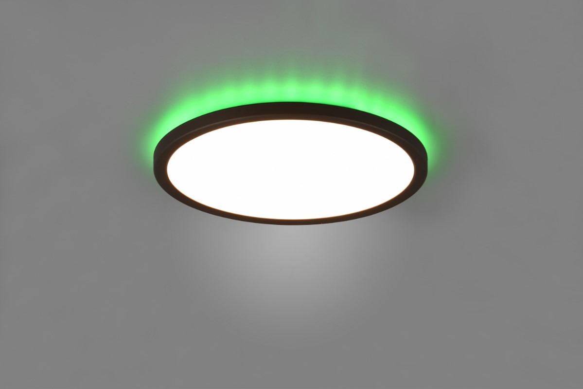 Een plafondlamp welke voor indirecte belichting zorgt en die ook voor wandmontage geschikt is. Het niet-verblindende aangename licht is afkomstig van een geïntegreerde LED lamp van 18W. De helderheid (10-100%) en lichttemperatuur (3000-6500K) van de lichtbron zijn traploos instelbaar met de meegeleverde afstandsbediening. De laatste instelling wordt opgeslagen en gebruikt wanneer de lamp opnieuw wordt ingeschakeld. Met de RGB-kleurenwisselaar kan de lamp ook rood, groen of blauw schijnsel uitstralen. Dankzij de nachtlampfunctie kunt u veilig uw weg vinden in het donker. Let wel, deze plafondlamp dient op een normale lichtschakelaar geplaatst te worden en is niet geschikt voor een externe dimmer.