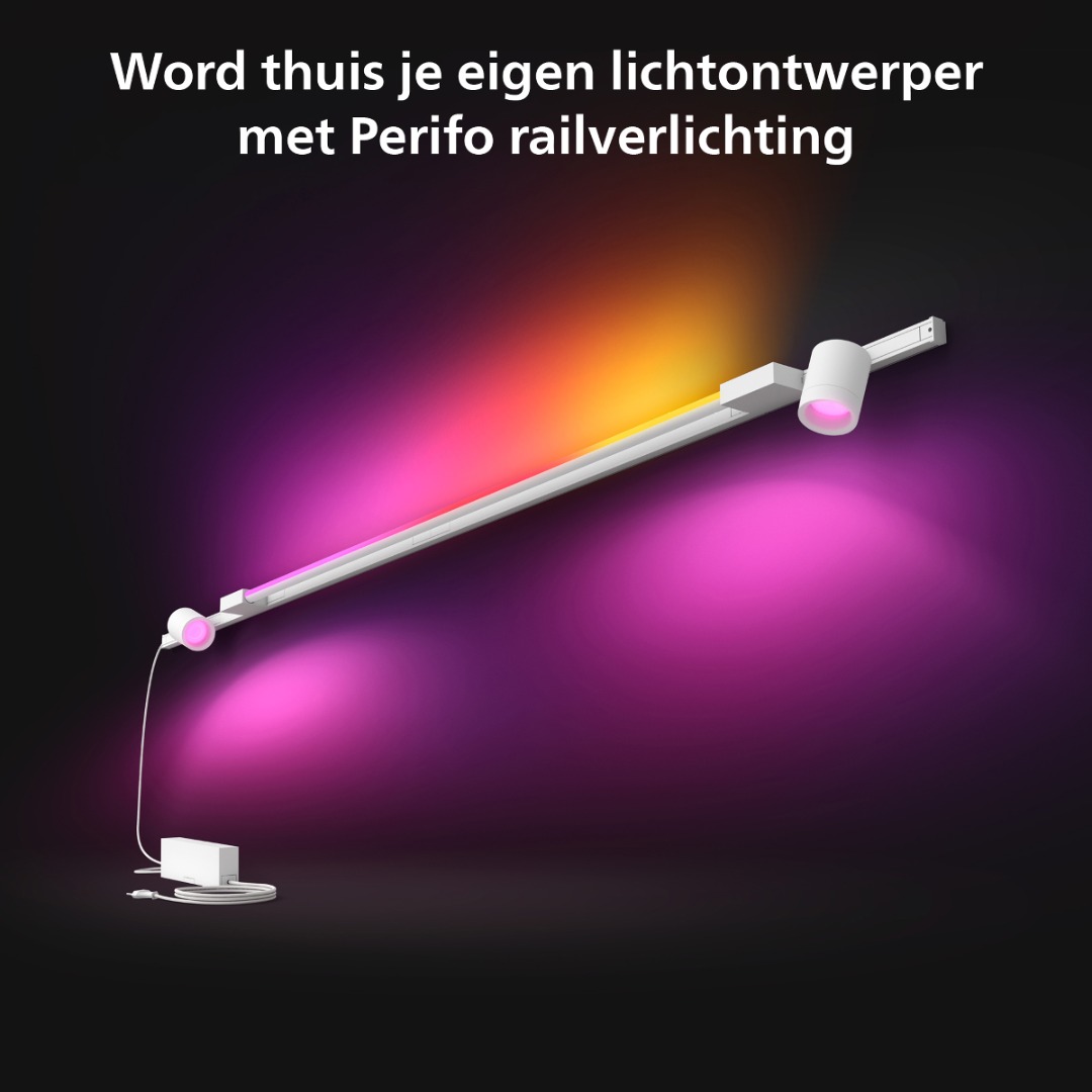 Een basisset uit het Perifo Railsysteem van Philips Hue in een prachtige witte kleur. Word designer in je eigen huis met het railsysteem van Philips Hue. Voeg eenvoudig lampen toe, plaats ze op de locatie waar jij wil, je kan echt alle kanten op. Volledig te personaliseren naar eigen wens en eenvoudig te bedienen vie de Hue app. In combinatie met de Hue Brigde (exclusief) maak je gebruik van alle mogelijkheden die Hue aanbiedt. Deze basisset bestaat uit 2 rails, een voeding, lichtbalk en 2 spots. Dit railsysteem is geschikt voor wandmontage.