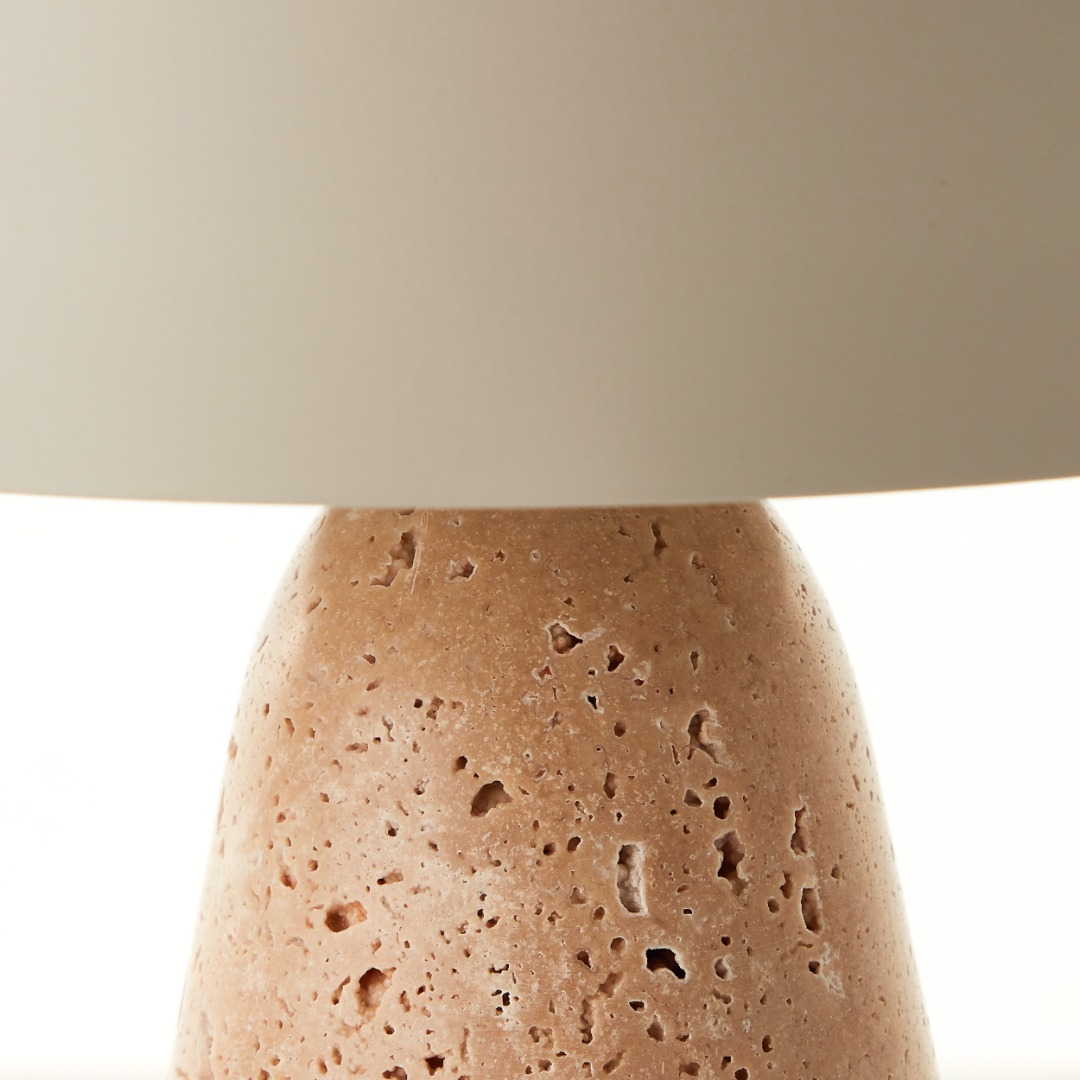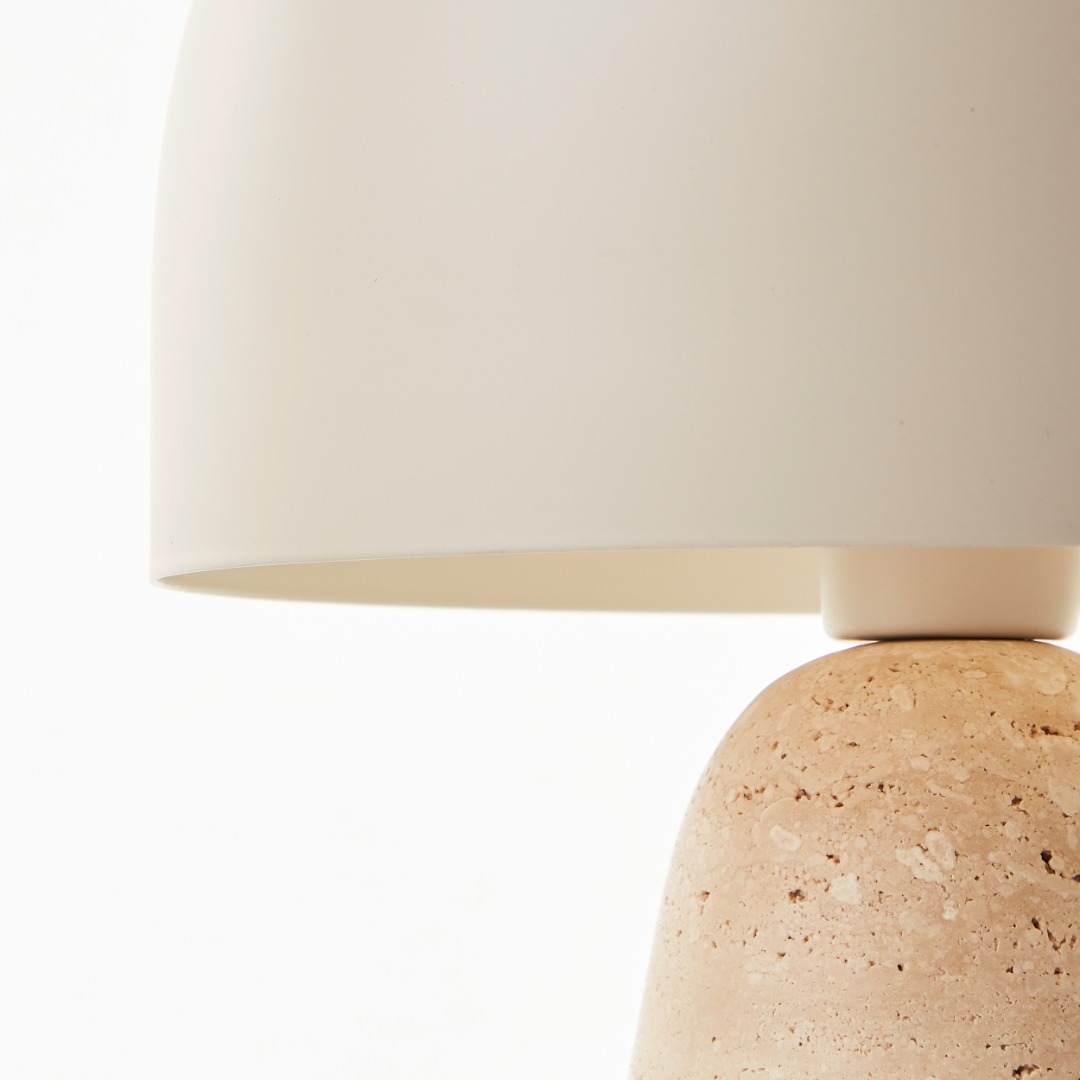 Een prachtige tafellamp met een travertin stenen voet. De lamp wordt afgemaakt door een prachtige beige kap. Echt een plaatje om te zien. De lamp heeft een handige snoerschakelaar om in-/ en uit te schakelen. Er zit een E14 fitting in geschikt voor een kogelvorm lichtbron van max. 40W. De lamp heeft een hoogte van 31,5 cm en de kap een diameter van 20 cm. De kap verspreidt mooi het licht naar beneden en zorgt dat je niet direct in de lichtbron kijkt.