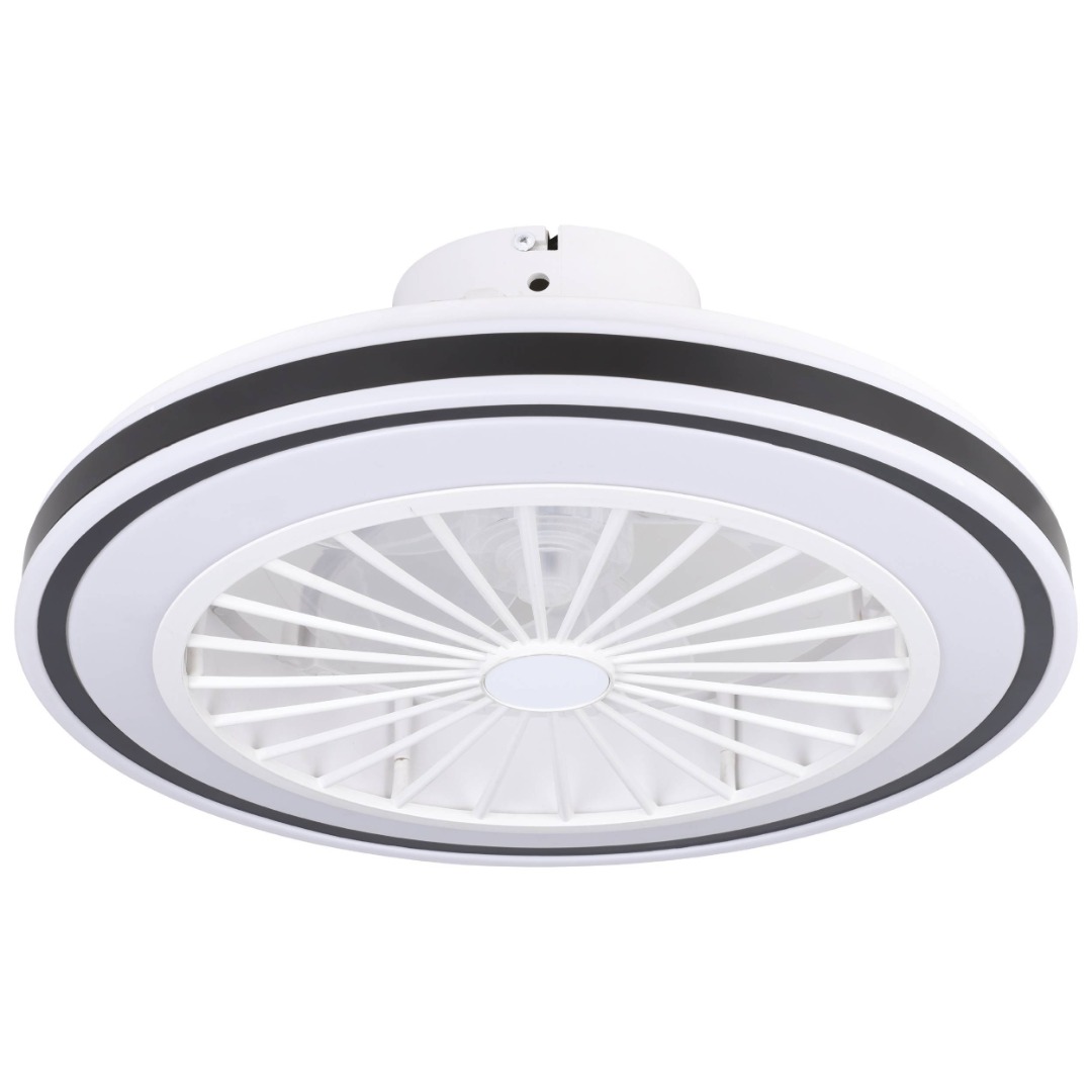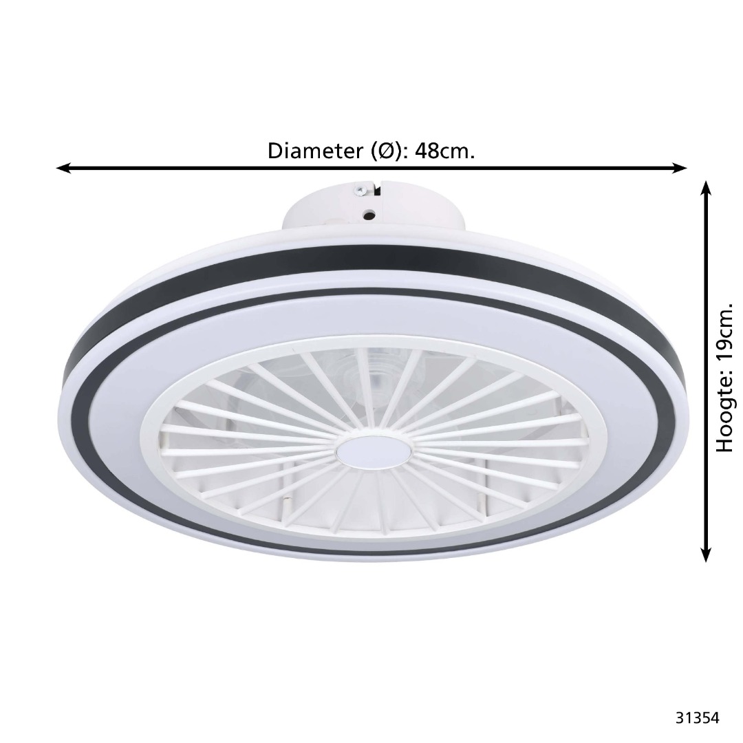 Een moderne plafondventilator zonder al te veel poespas. Het wit met zwarte design zorgt dat de ventilatorlamp bijna in elk interieur wel past. De lamp kan je instellen van warm tot koelwit (2700K-6500K) en is ook nog eens dimbaar. De ventilator is in te stellen in 3 snelheden. Dit alles stel je in met de meegeleverde afstandsbediening.