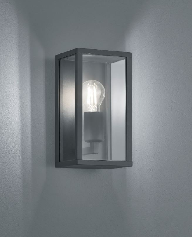 Een lantaarn van het merk Trio. Deze wandlamp is gemaakt van gegoten aluminium en uitgevoerd in de kleur antraciet. Deze lamp met strakke vormgeving zal goed passen in moderne tuinen op de schutting of gevel. Deze wandlamp is met een IP-waarde van 44 spatwaterdicht. U kunt zelf bepalen hoeveel licht u wilt hebben, daar deze lamp exclusief lichtbron geleverd wordt. Achter het transparante glas is plaats voor één E27-fitting die geschikt is voor een max. wattage van 60W. Omdat de lichtbron bij deze wandlamp echt centraal staat, zou u bijvoorbeeld kunnen kiezen voor een goudkleurig edisonlampje.