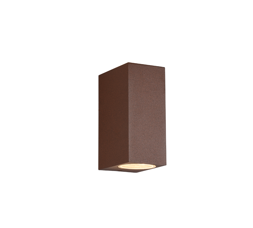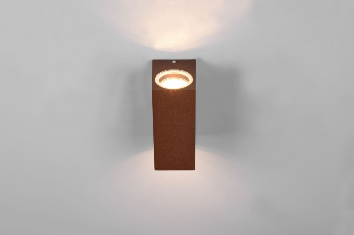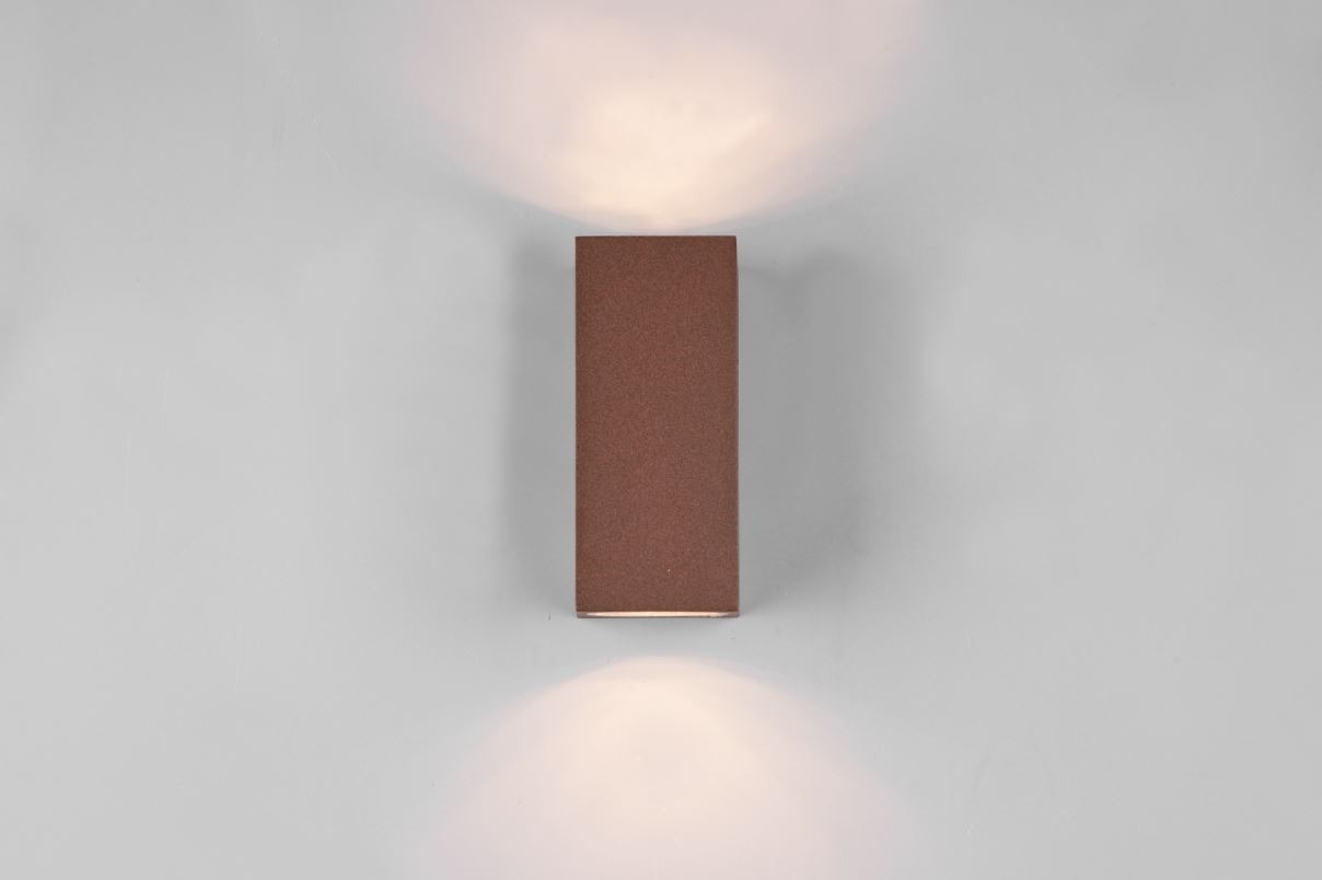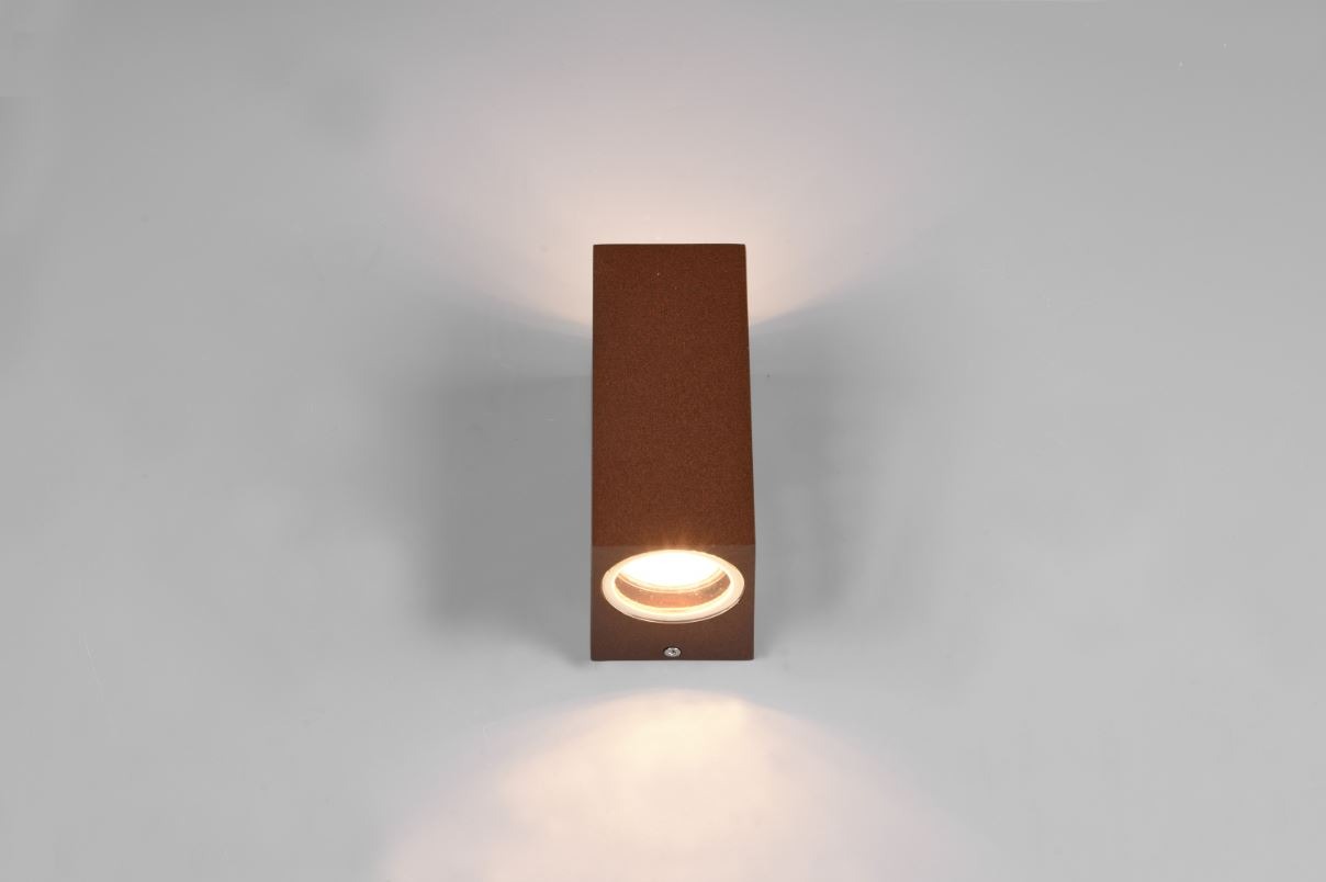 Een mooie wandlamp van het merk Trio. Deze lamp is gemaakt van gegoten aluminium en uitgevoerd in een warme roestkleur. Deze buitenlamp met simplistische uitstraling past goed op moderne schuttingen of gevels. Deze wandlamp is met een IP-waarde van 44 spatwaterdicht. De buitenlamp heeft twee GU10-spots nodig, die niet zijn inbegrepen maar die afzonderlijk bijbesteld kunnen worden. Let hierbij op dat het maximale wattage van 35W niet overschreden wordt. Deze armatuur geeft licht naar boven en naar onderen.