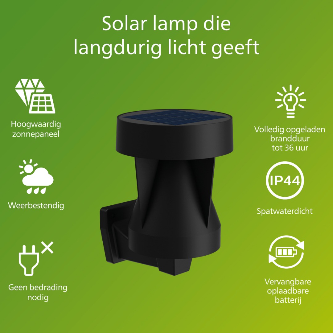 Een leuke, moderne wandlamp uit de Solar collectie van Philips. De lamp is eenvoudig in gebruik te nemen omdat deze op solar werkt. Geen ingewikkeld installatiewerk met allerlei snoeren dus, gewoon ophangen en de lamp laten opladen en geniet van het prachtige warme licht wat de lamp afgeeft. Staat bijvoorbeeld erg leuk langs een tuinpad of tussen de bloemen.