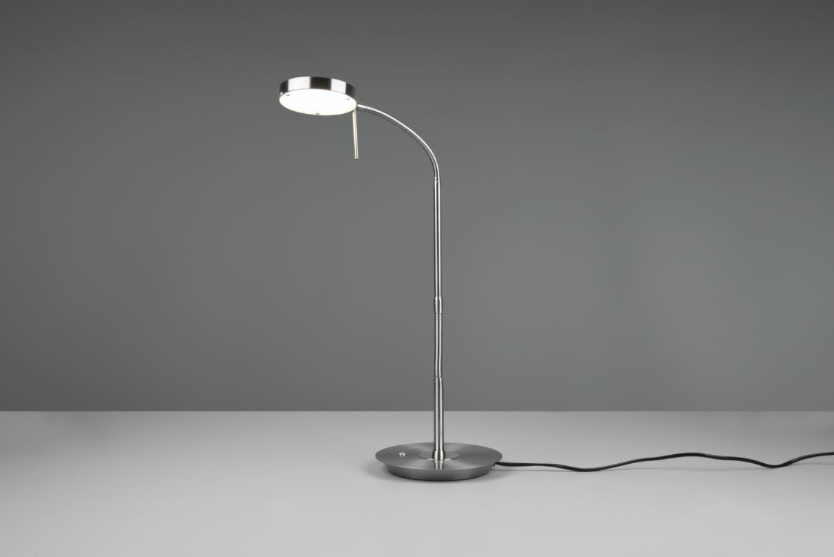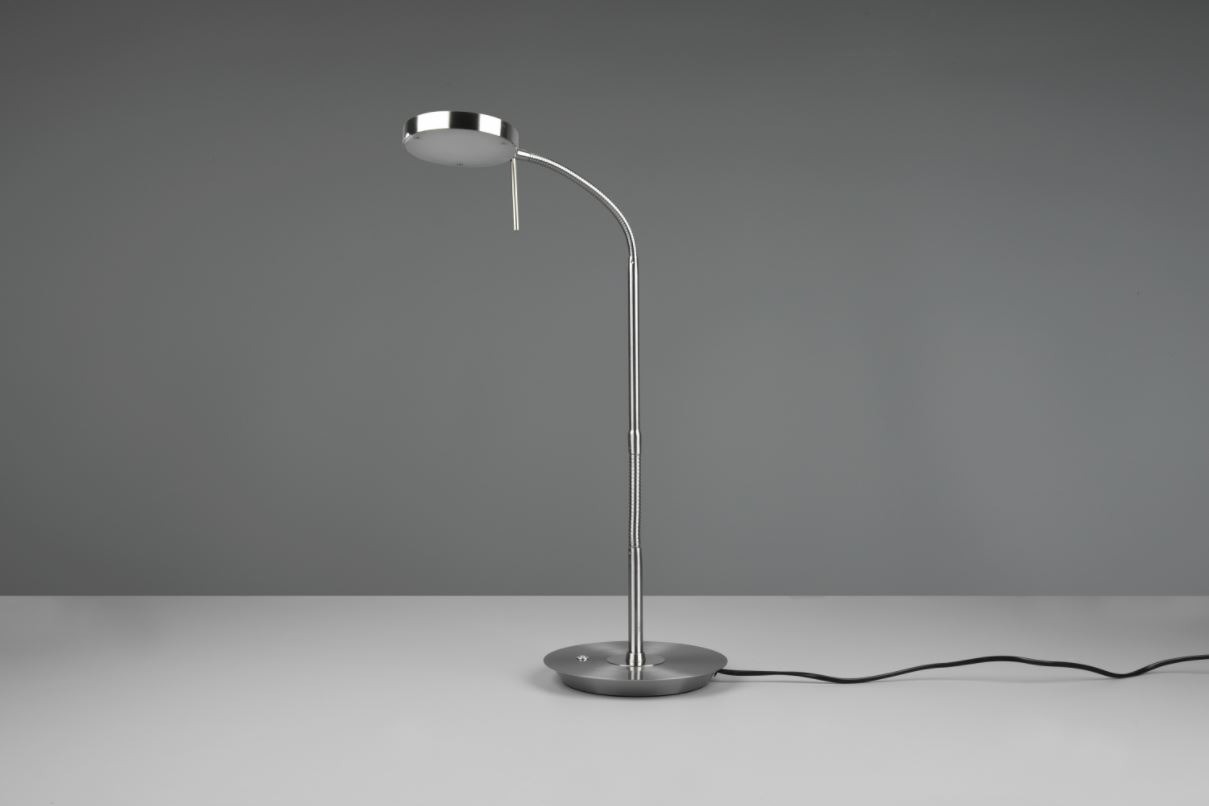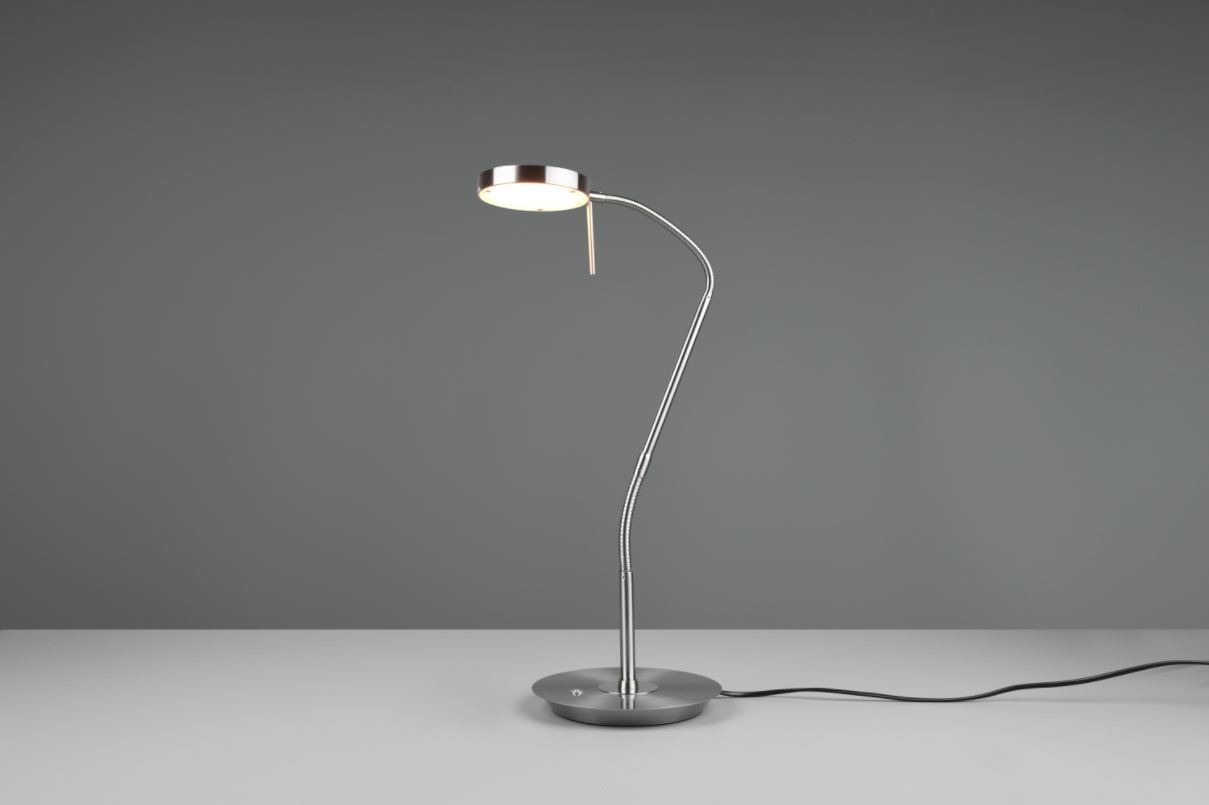 Een tafellamp van het merk Trio welke gemaakt is van metaal en uitgevoerd is in de kleur nikkel mat. Deze moderne bureaulamp heeft een flexibele aanpasbare arm waardoor deze gemakkelijk in functioneel licht kan voorzien. Dit maakt hem onmisbaar op het bureau in de woon- of werkkamer. Dit tafellampje wordt inclusief lichtbron geleverd, te weten een geïntegreerde SMD-LED lamp met een wattage van 12W. Deze armatuur kan door de geïntegreerde sensordimmer traploos gedimd worden. De lichtkleur (lichttemperatuur in graden Kelvin) is op verschillende niveaus instelbaar. Deze tafellamp beschikt over een geheugenfunctie, d.w.z. wanneer de lamp opnieuw ingeschakeld wordt, wordt de laatst opgeslagen instelling gebruikt.