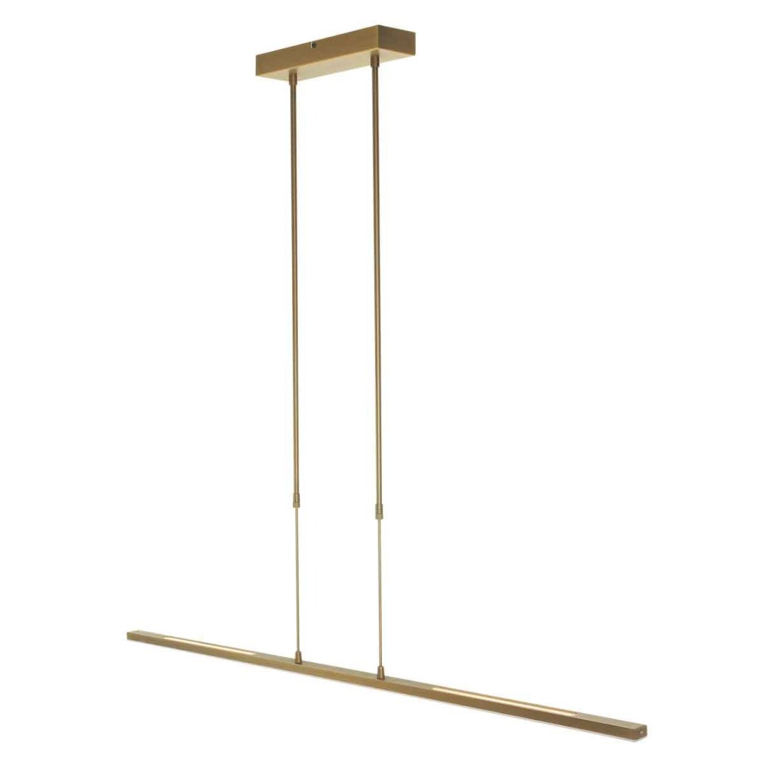 Gouden hanglamp met strak design uit de Zelena LED collectie. De lamp is zeer functioneel doordat zowel de boven als onderkant 2 lichtpunten hebben. De lamp is te dimmen door middel van de pushdimmer op het armatuur, de kleurtemperatuur is instelbaar van 2200K tot maximaal 4000K. U kunt de lamp praktisch in hoogte verstellen van 82 cm tot 117 cm. De lamp is voorzien van led lichtbronnen.