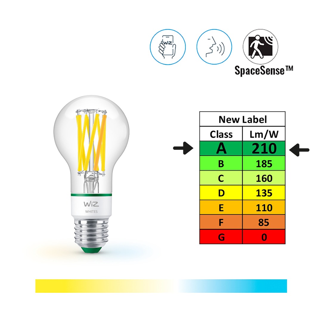 Met de slimme verlichting van WiZ kunt u alle kanten op! De lampen zijn gelijk aan te sluiten via uw Wi-Fi netwerk, dus zonder gedoe. Download de app en ga aan de slag met het dimmen van de lampen, timers instellen en de vele andere mogelijkheden. Ook te gebruiken met matter. De Filamentlampen zien er ook nog eens prachtig uit om in een open armatuur te stoppen. De lamp heeft een prachtig transparant glas en zuinige A-beoordeling en bespaart hierdoor 40% energie t.o.v. standaard leds. De lichtkleur van deze lamp is instelbaar tussen 2700K-4000K.