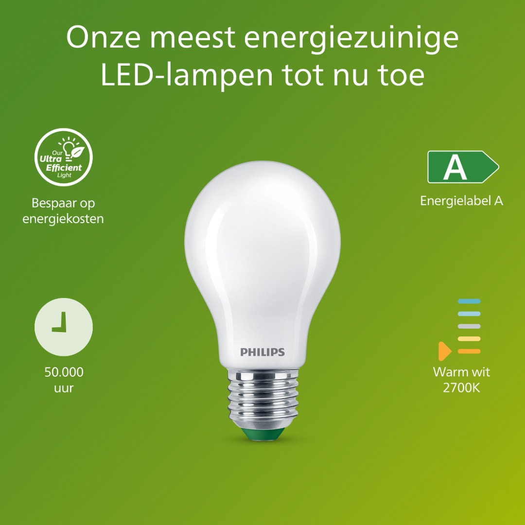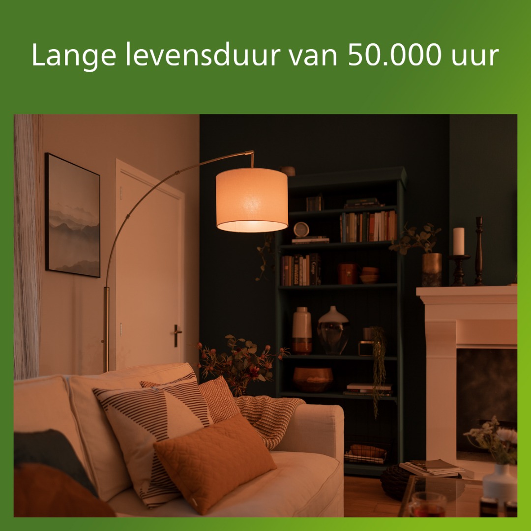 Een energiezuinige ledlamp uit de Groene lijn van Philips. Vertrouwde ledlampen in een vernieuwd, nog zuiniger jasje. De lamp geeft warm wit licht van 2700K en is direct op volledige lichtsterkte. De lamp heeft mat wit glas. Het betreft een set van 6 lampen.