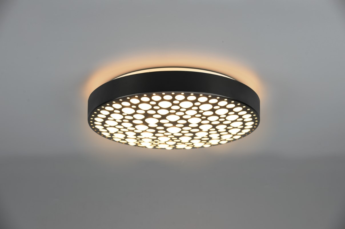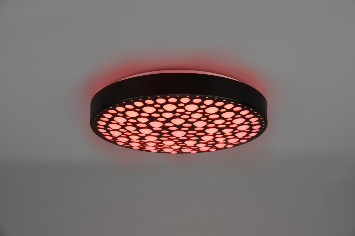 Een plafondlamp van het Duitse verlichtingsmerk Trio. Deze modern vormgegeven plafonnière is vervaardigd uit kunststof en uitgevoerd in de kleur mat zwart en heeft een diameter van 40 cm. Het witte kunststof zorgt voor de verspreiding van aangenaam niet-verblindend diffuus licht. Een lichtbron is inbegrepen, het gaat om een SMD-LED lamp van 22W. Met de meegeleverde afstandsbediening kan de lichtsterkte ingesteld worden tussen 10 en 100%. Met de nachtlampfunctie wordt de lichtsterkte op 6% ingesteld. De lichtkleur (lichttemperatuur in graden Kelvin) is traploos instelbaar tussen 2700 en 6000K. Daarnaast kan ook gekozen worden voor verschillende kleuren dankzij de RGB-kleurenwisselaar. Het is zelfs mogelijk om een regenboog te laten verschijnen.