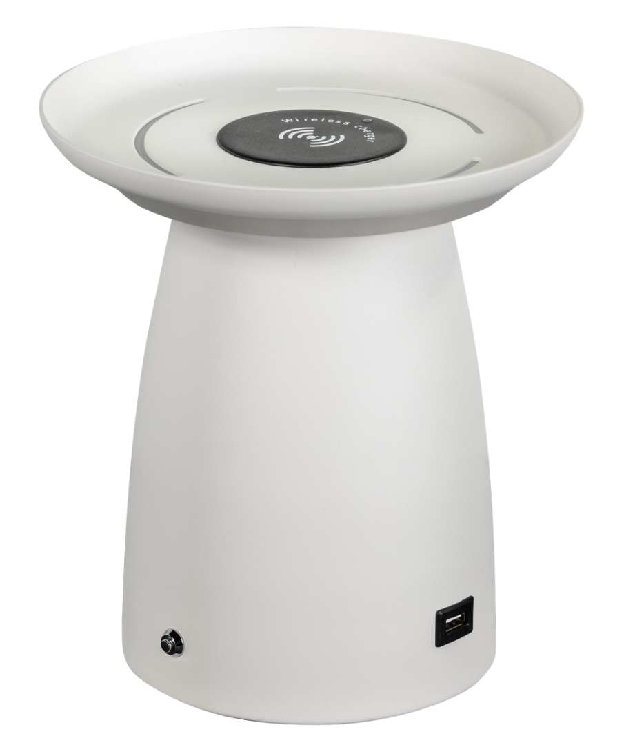 Heel handig is deze Soof tafellamp. Erg geschikt om bijvoorbeeld op uw nachtkastje te plaatsen. De lamp heeft bovenaan een plateau waar een Wireless Charger op zit. Laad uw telefoon op (indien geschikt hiervoor) door hem gewoon erop te leggen. Boven dat beschikt de lamp ook nog eens over een USB plug. Dubbel handig dus!