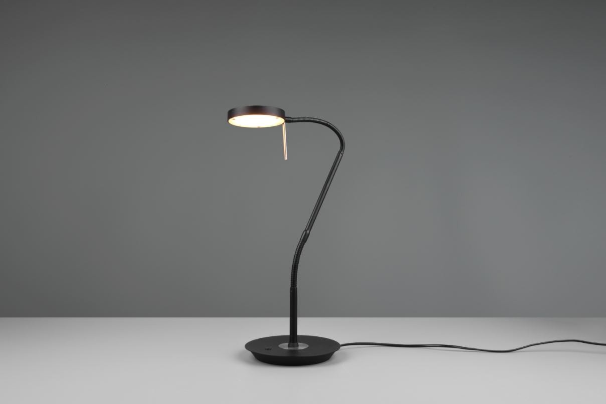 Een tafellamp van het merk Trio welke gemaakt is van metaal en uitgevoerd is in de kleur mat zwart. Deze moderne bureaulamp heeft een flexibele aanpasbare arm waardoor deze gemakkelijk in functioneel licht kan voorzien. Dit maakt hem onmisbaar op het bureau in de woon- of werkkamer. Dit tafellampje wordt inclusief lichtbron geleverd, te weten een geïntegreerde SMD-LED lamp met een wattage van 12W. Deze armatuur kan door de geïntegreerde sensordimmer traploos gedimd worden. De lichtkleur (lichttemperatuur in graden Kelvin) is op verschillende niveaus instelbaar. Deze tafellamp beschikt over een geheugenfunctie, d.w.z. wanneer de lamp opnieuw ingeschakeld wordt, wordt de laatst opgeslagen instelling gebruikt.
