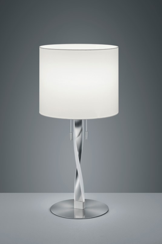 Een tijdloze tafellamp van het Duitse verlichtingsmerk Trio. Dit schemerlampje kan goed worden geplaatst op een kast of bijzettafel in de woonkamer of hal bijvoorbeeld. De twee geïntegreerde LED lampen die langs de spiraalvormige lampenvoet lopen zorgen voor sfeervol indirect licht. De lamp is gemaakt van metaal en uitgevoerd in de kleur nikkel mat. Deze tafellamp met design uitstraling past in zowel klassieke als moderne interieurs. De lamp heeft een kap van textiel met een diameter van 30 cm. De witte kap biedt plaats aan één E27-fitting die geschikt is voor een maximaal vermogen van 40W. De verschillende lichtbronnen kunnen afzonderlijk aan- en uitgeschakeld worden middels de trekschakelaars.