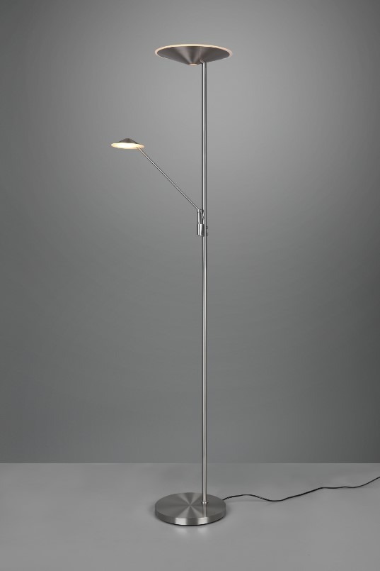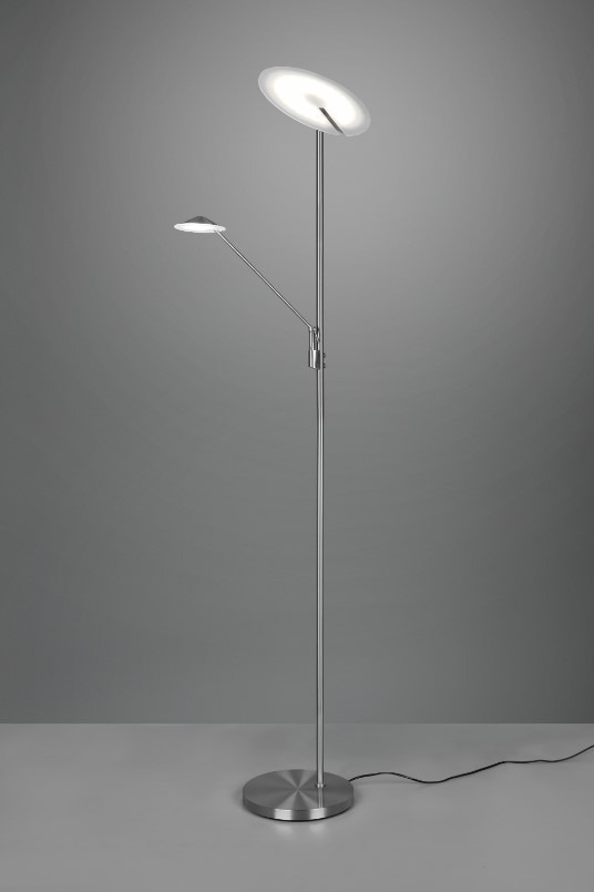 Een moderne vloerlamp met praktische functies die goed naast bank of fauteuil geplaatst kan worden. Deze elegante leeslamp is gemaakt van metaal en uitgevoerd in de kleur nikkel met een matte afwerking. De vloerlamp heeft twee LED lichtbronnen die afzonderlijk van elkaar zijn in en uit te schakelen. De helderheid en lichtkleur (kleurtemperatuur in graden Kelvin) kunnen eenvoudig worden gedimd en aangepast via een geïntegreerde sensordimmer. Dankzij de geheugenfunctie wordt het laatst ingestelde lichtscenario opgeslagen.