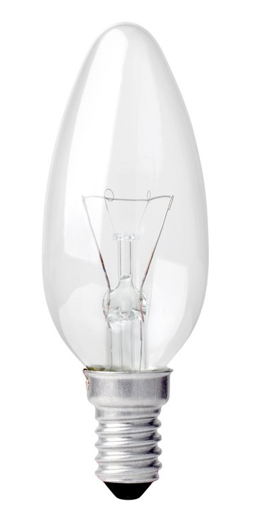 Een heldere kaars gloeilamp van 60W met dunne E14 fitting. De gloeilamp is direct op volledige lichtsterkte.