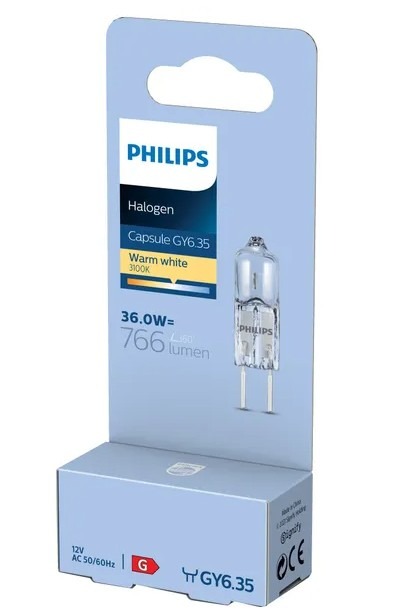 Philips Halogeen capsule met een GY6.35 pin fitting geschikt voor armaturen met 12V. De lampen zijn dimbaar en direct op volledige lichtsterkte.
