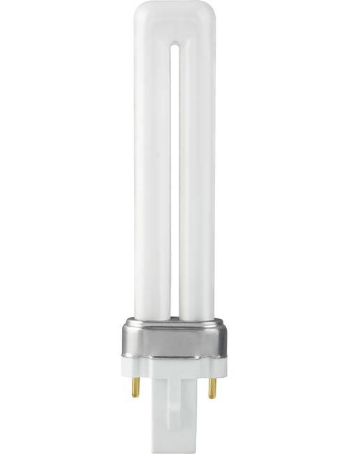 Een traditionele PL-s compacte fluorescentielamp met een G23 fitting. De lamp heeft een koele daglichtkleur van 6500K en een verbruik van 7W.