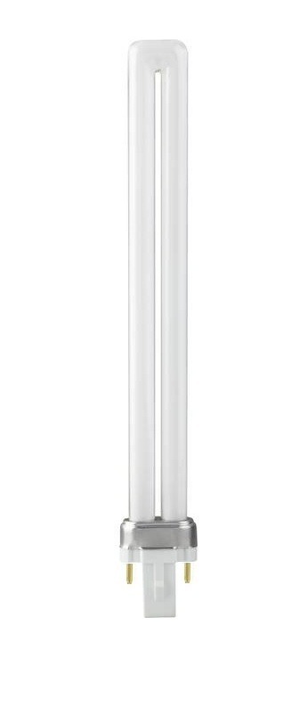 Een traditionele PL-s spaarlamp met een G23 fitting. De lamp heeft een koele daglichtkleur van 6500K en een verbruik van 11W.