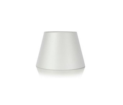 Originele Satijnen lampenkap Tolomeo van Artemide. Rond model met metalen frame. Kap is gemaakt van aluminiumkleurig satijn. Als de lamp uit is kap licht grijs van kleur en als de lamp aan staat lijkt de kap zijdeachtig wit. De kap heeft een diameter van 18 cm, gemeten vanaf de onderkant.