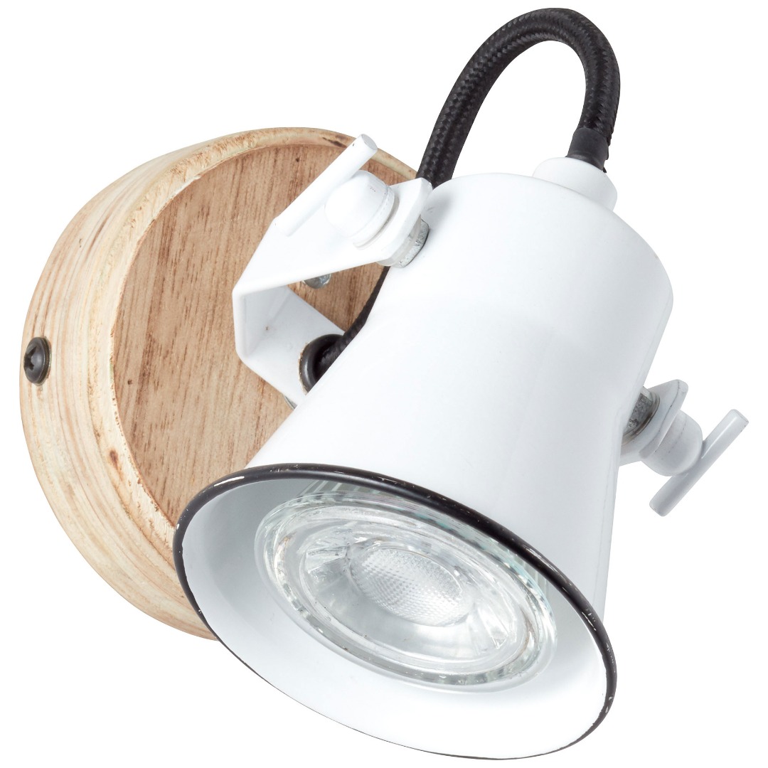 Een 1-licht opbouwspot met een landelijke uitstraling uit de collectie van het merk Brilliant. De lamp is gemaakt van metaal en hout en heeft een witte kleur met lichtbruin houten accenten. De lamp heeft een richtbare spotkop en wordt geleverd exclusief lichtbron geschikt voor max. 5 watt. Deze lamp kan goed geplaatst worden in de hal, woonkamer of slaapkamer. Met deze opbouwspot kan het licht mooi gericht worden naar de gewenste plekken.