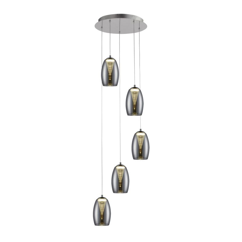 Een mooie hanglamp uit de collectie van het merk Brilliant gemaakt van metaal en glas in een chromen kleur met een gerookt glas. De lamp heeft een mooie stijvolle look en geeft een mooie, rustige uitstraling in het interieur. De lamp wordt geleverd inclusief geïntegreerde LED lichtbronnen die een wattage hebben van 5x 5W. Deze lamp kan goed geplaatst worden in de eetkamer boven de eettafel of in een ruime hal. De lamp heeft een mooie stijvolle uitstraling en is een prachtig decoratief item. De lamp kan eenvoudig gedimd worden door het EasyDim systeem. Hiervoor is geen aparte wanddimmer nodig, maar kan dit via de normale muurschakelaar. Door deze snel uit/aan te drukken wordt de lamp gedimd van 100% naar 10%.