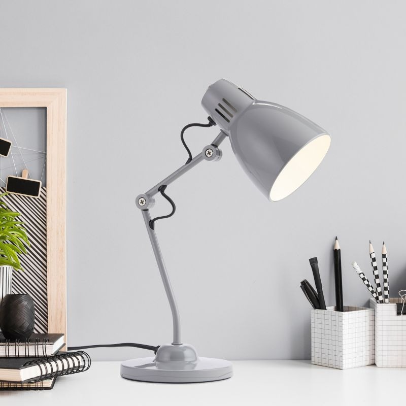Een tafellamp met een moderne look uit de collectie van het merk Brilliant. De lamp is gemaakt van metaal in een grijze kleur. De lamp wordt geleverd exclusief lichtbron met een E14 fitting en geschikt voor max. 40W. Deze lamp kan goed geplaatst worden in verschillende ruimtes zoals woonkamer en slaapkamer. Bijvoorbeeld in een vensterbank, op een bijzettafel of nachtkastje, maar ook zeker in een kantoor op een bureautafel. De lamp heeft een handige snoerschakelaar en een draaibare kop. De hoogte en helling is in te stellen bij deze lamp.