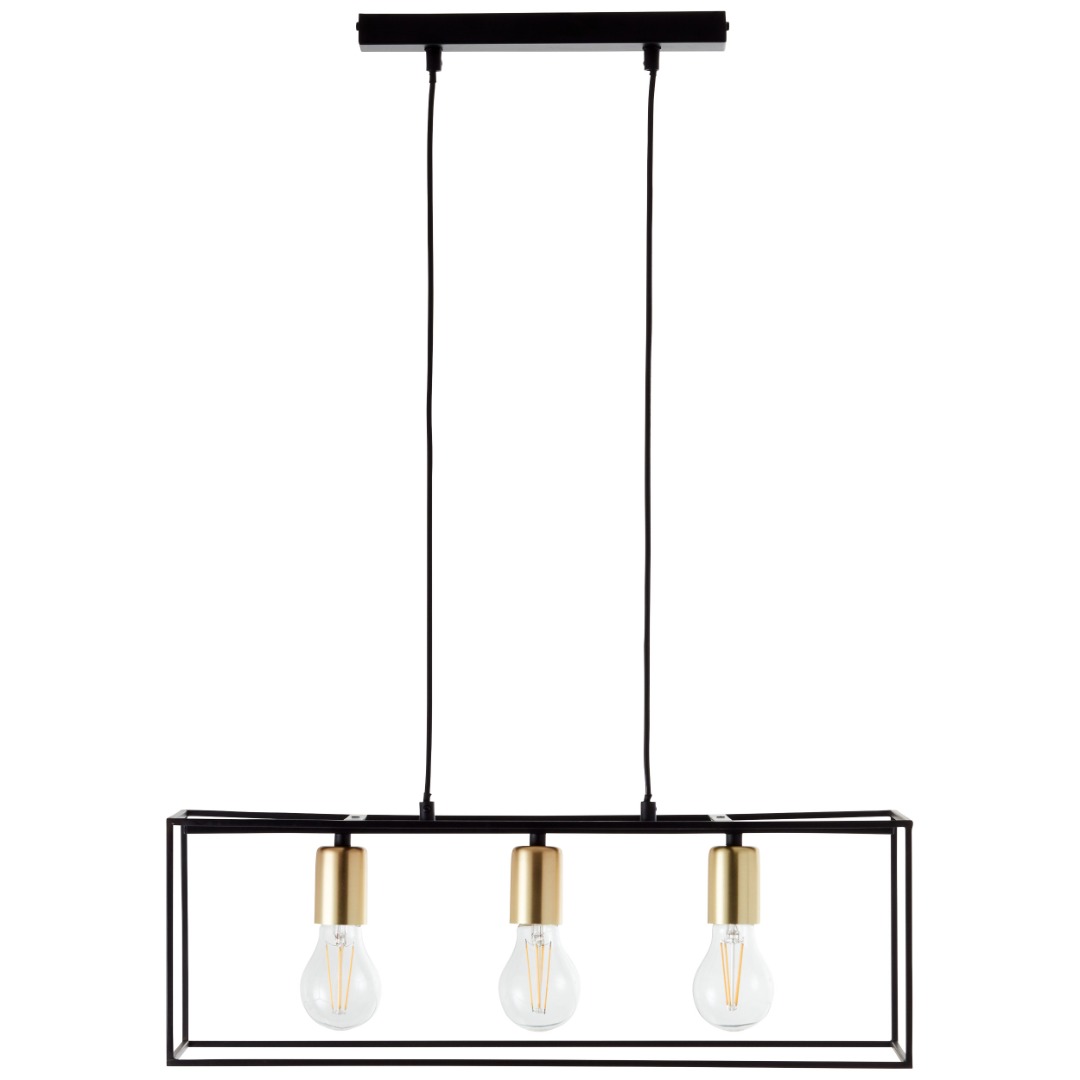 Een hanglamp met een strakke moderne look uit de collectie van het merk Brilliant. De lamp is gemaakt van metaal en heeft een zwarte kleur met messing accenten. De lamp wordt geleverd exclusief lichtbronnen met E27 fittingen en geschikt voor max. 3x 60W. Deze lamp kan goed geplaatst worden in de eetkamer boven de eettafel of elders in de woonkamer. De hoogte van de kabel kan worden aangepast tijdens installatie.