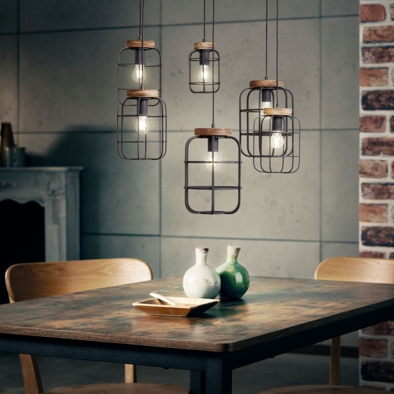 Een mooie hanglamp uit de collectie van het merk Brilliant met een industriële uitstraling. De lamp is gemaakt van metaal en hout in een houtkleur met zwart. Door het gebruik van hout geeft deze lamp een mooie natuurlijke look in het interieur. Het hout wat gebruikt is voor het maken van deze lamp komt uit duurzaam bosgebied en is FSC-gecertificeerd. Door de verschillende vormen van de metalen kappen heeft deze lamp een unieke, speelse uitstraling. De lamp wordt geleverd exclusief lichtbronnen met E27 fittingen en is geschikt voor max. 6x 52 watt. Deze lamp kan goed geplaatst worden in een eetkamer boven een eettafel.
