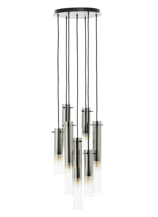 Een hanglamp met een moderne uitstraling uit de collectie van het merk Brilliant. De lamp is gemaakt van metaal en glas in een zwarte kleur met een zwart-transparant gerookt glas. Het glas geeft een hele chique look aan deze lamp. De lamp wordt geleverd exclusief lichtbronnen met E14 fittingen en geschikt voor max. 7x 25W. Deze lamp kan goed geplaatst worden boven een eettafel in de eetkamer, of misschien zelfs in een mooie hoge hal/entree.