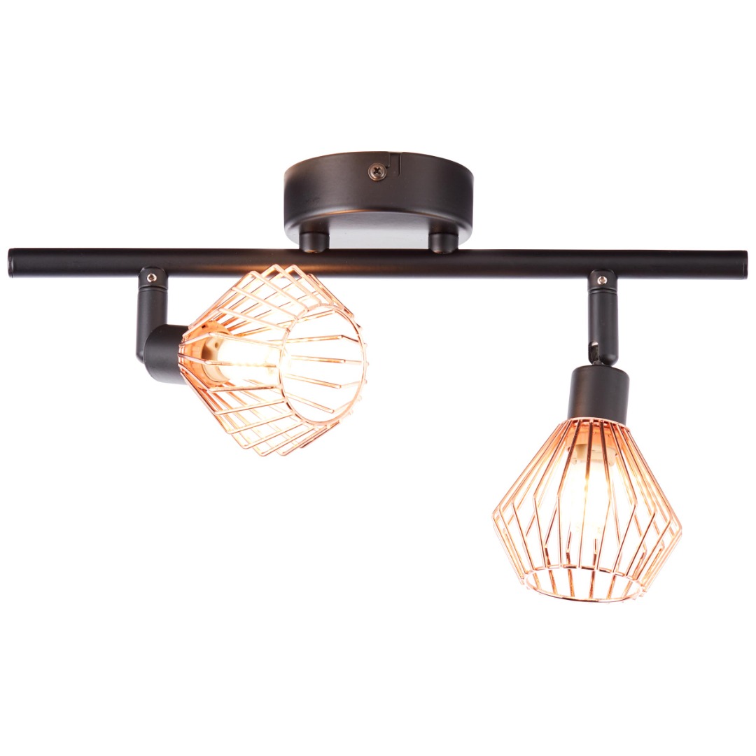 Een opbouwspot met een moderne uitstraling uit de collectie van het merk Brilliant. De lamp is gemaakt van metaal en heeft een zwarte kleur gecombineerd met een koperen kleur. De lamp heeft richtbare spotkoppen en wordt geleverd exclusief lichtbronnen met G9 fittingen en geschikt voor max. 2x 33W. Deze lamp kan goed geplaatst worden in de hal, woonkamer of slaapkamer.