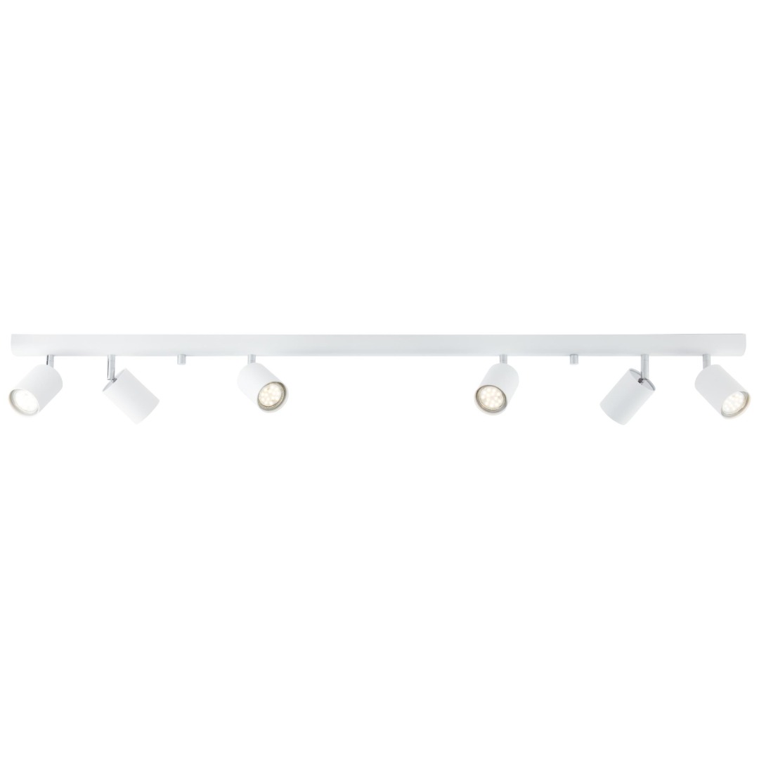 Een 6-lichts opbouwspot met een moderne uitstraling uit de collectie van het merk Brilliant. De lamp is gemaakt van metaal en heeft een geheel witte kleur. De lamp heeft richtbare spotkoppen en wordt geleverd exclusief GU10 lichtbronnen geschikt voor max. 6x 35W watt. Deze lamp kan goed geplaatst worden in de woonkamer of slaapkamer. Met deze opbouwspot kan het licht mooi gericht worden naar de gewenste plekken door de draaibare spotkoppen.