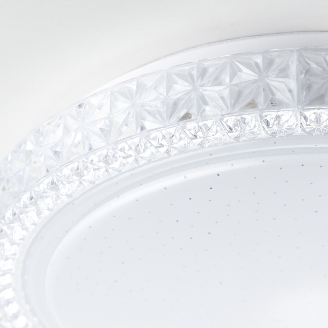 Een moderne plafondlamp uit de collectie van het merk Brilliant. De lamp is gemaakt van metaal en plastic en heeft een witte kleur. De lamp wordt geleverd inclusief ingebouwde LED lamp die een wattage heeft van 12 watt. Deze lamp kan goed geplaatst worden in de hal, woonkamer of slaapkamer. De lamp heeft een opvallende look door de kristal-achtige rand.