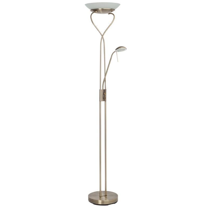 Een mooie vloerlamp van Brilliant met apart leeslampje wat ook wel een upligther wordt genoemd. De lamp geeft een gezellige sfeer in de woonkamer en heeft daarnaast een handig lampje om bij te lezen. Deze zijn regelbaar via een draaidimmer op het armatuur. Het materiaal van de lamp is metaal en glas en de lamp heeft een bijzondere antiek bronzen kleur. De lamp is uitgerust met geïntegreerde LED lampen van 26W en 4,5W in het leeslampje. Het is een grote lamp, van wel 180 cm hoog, die een mooie indruk maakt in het interieur. De arm kan naar wens worden gericht.