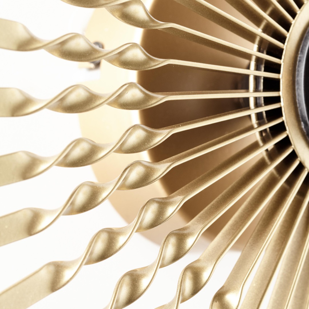 Een opvallende wandlamp uit de collectie van het merk Brilliant. De lamp is gemaakt van metaal en heeft een gouden kleur. De lichtspreiding geeft een leuk en bijzonder effect op de muur. De lamp wordt geleverd exclusief lichtbron met een E27 fitting en is geschikt voor max. 52 watt. Deze lamp kan goed geplaatst worden in de hal, woonkamer of slaapkamer.