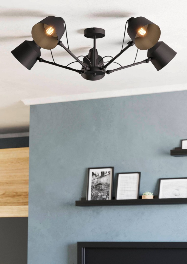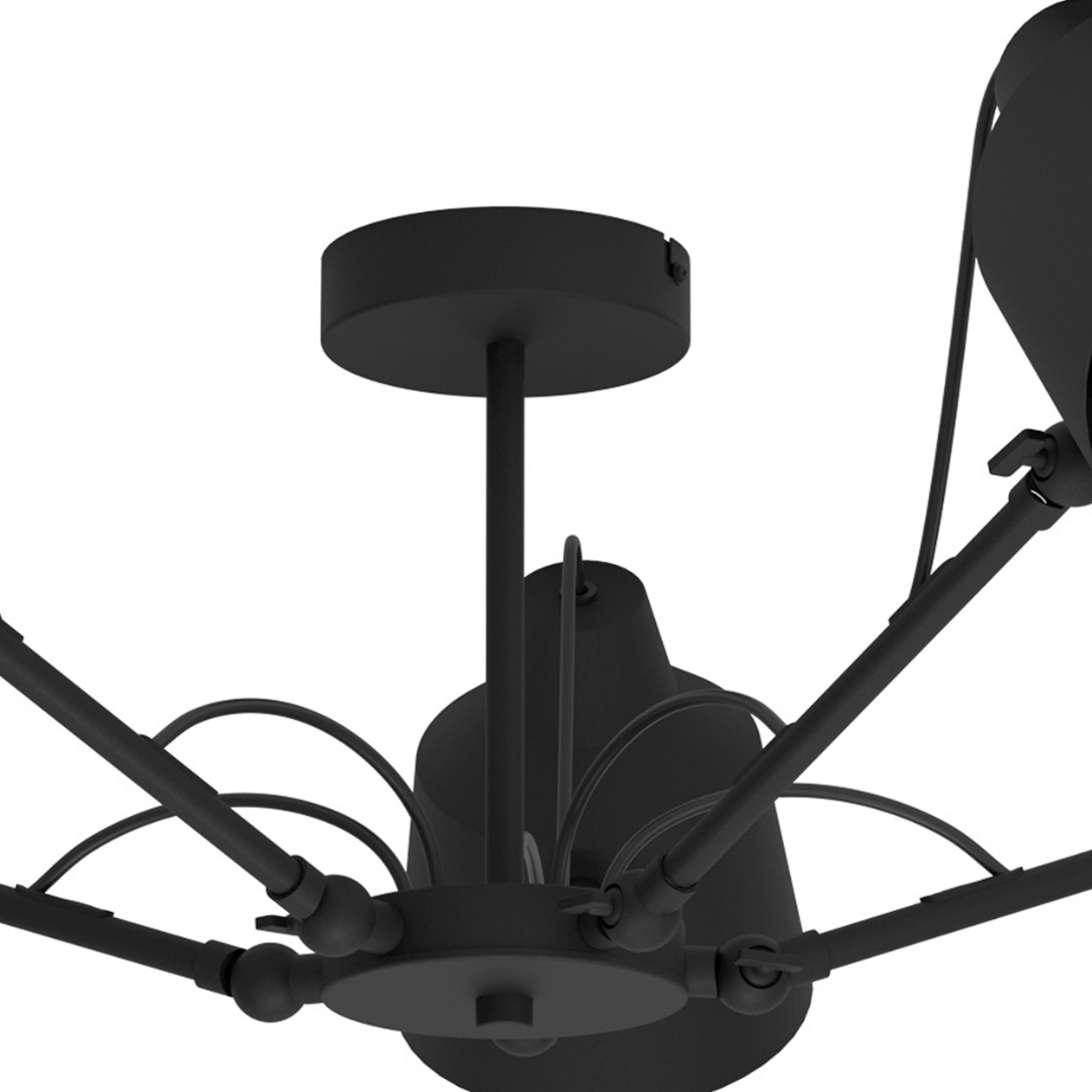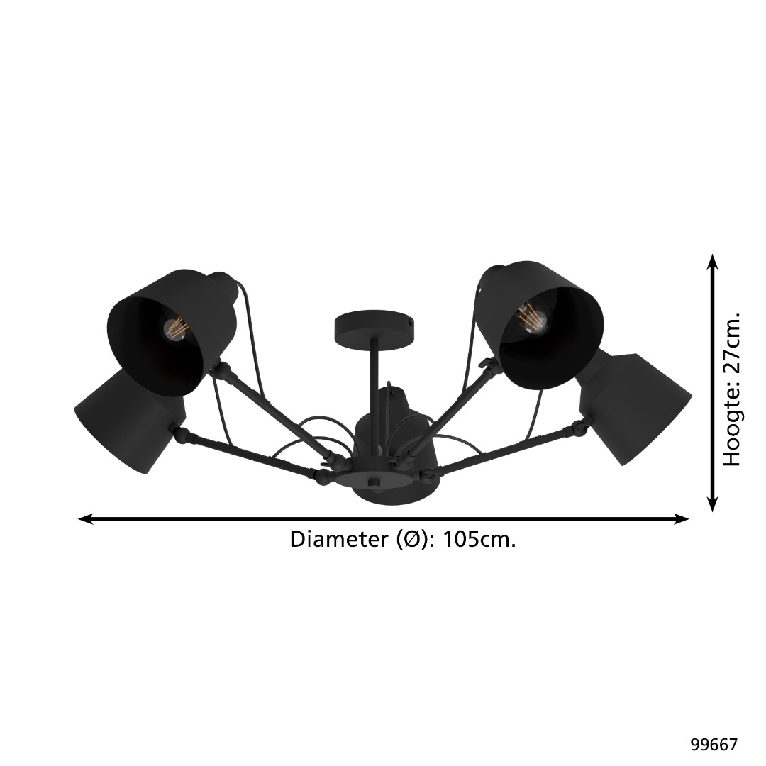 Een design plafondlamp uit de plafondlampen collectie van het merk Eglo. De lamp is gemaakt van staal in de kleur zwart. De lamp wordt geleverd exclusief E27 lichtbronnen geschikt voor max. 5x 40W. Deze lamp kan goed geplaatst worden in de woonkamer of slaapkamer. De lamp heeft naast de moderne look ook een industriële uitstraling en is hierdoor toepasbaar in verschillende interieur soorten. Door de buigbare delen in de lamp kan deze op verschillende manieren worden gericht.