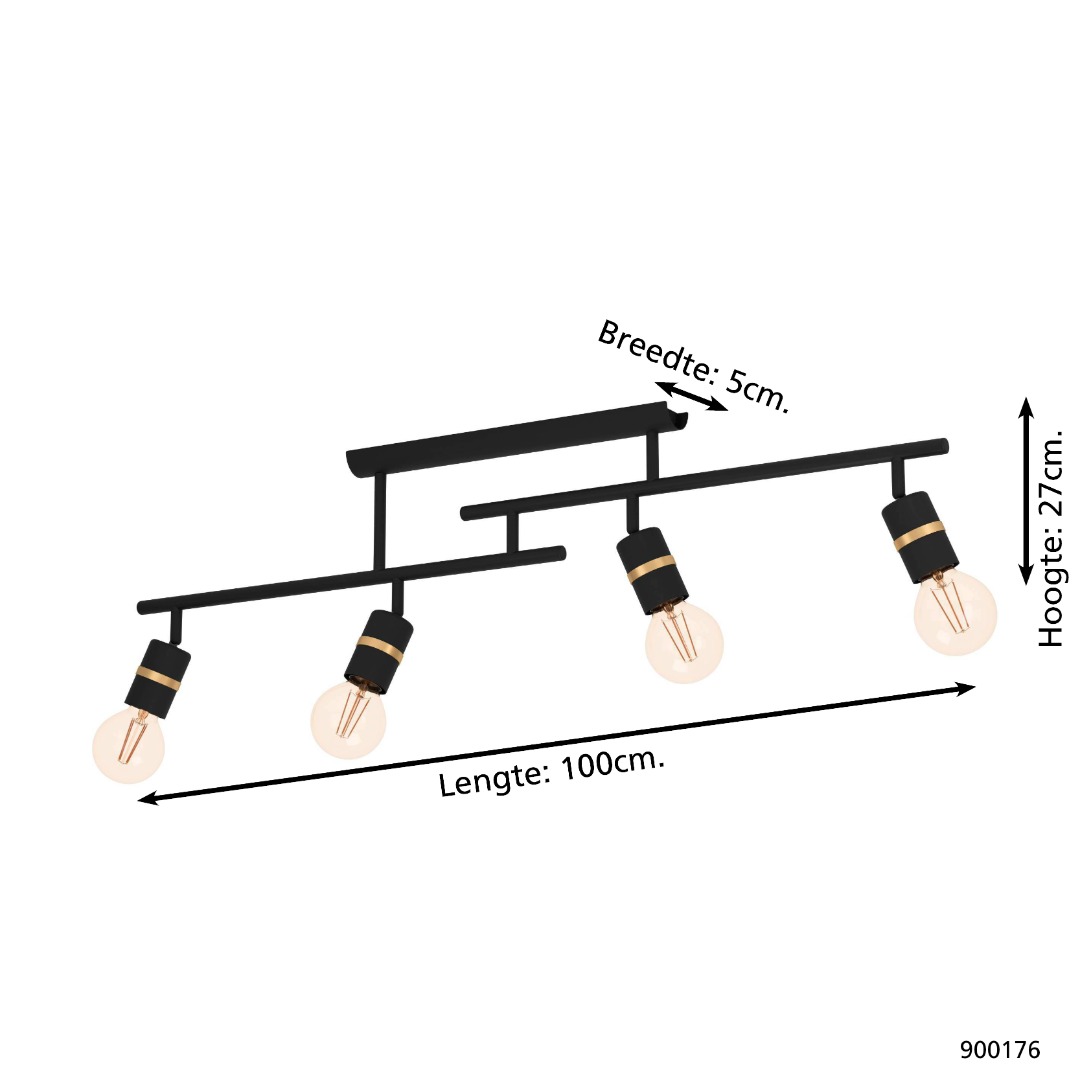 Een plafondlamp uit de collectie van Eglo met een moderne uitstraling. De lamp is gemaakt van staal en heeft een zwarte kleur met geelkoperen accenten. Deze lamp is een mooi voorbeeld van een lamp die goed kan worden toegepast op verschillende plekken in de woning zoals hal, slaapkamer of woonkamer. De lamp wordt exclusief lichtbronnen geleverd en is geschikt voor max. 4x 10W met E27-fittingen.