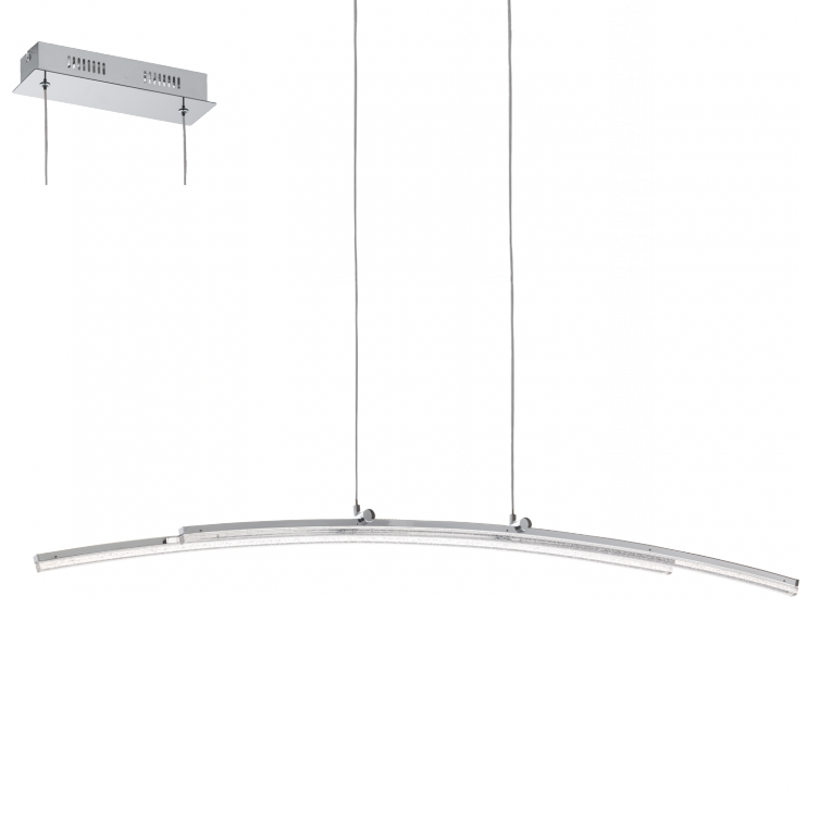 Een moderne hanglamp uit de lighting collectie van Eglo. De lamp is chroom en transparant van kleur en gemaakt van staal, aluminium en kunststof. De lamp wordt inclusief LED lichtbron geleverd. De lamp is geschikt voor een max. wattage van 2x 10,8W. Deze lamp is een goed voorbeeld van een lamp die mooi in de woonkamer of boven een eettafel kan worden opgehangen.