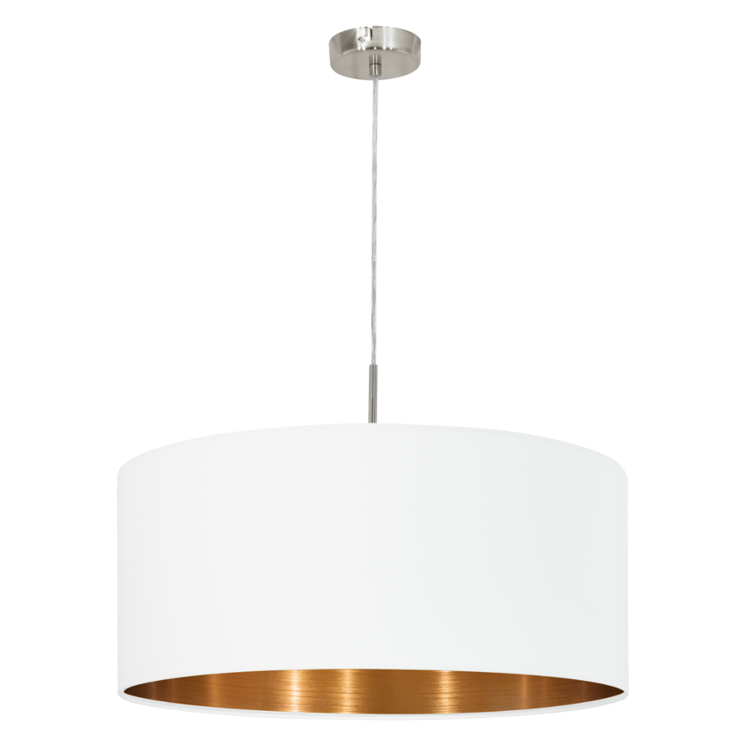 Een mooie hanglamp uit de lighting collectie van Eglo. De lamp is wit met koper van kleur en gemaakt van staal en textiel. De lamp wordt exclusief lichtbron geleverd. De lamp is geschikt voor een max. wattage van 1x 60W. Deze lamp is een goed voorbeeld van een lamp die mooi in de woonkamer of eetkamer kan hangen.