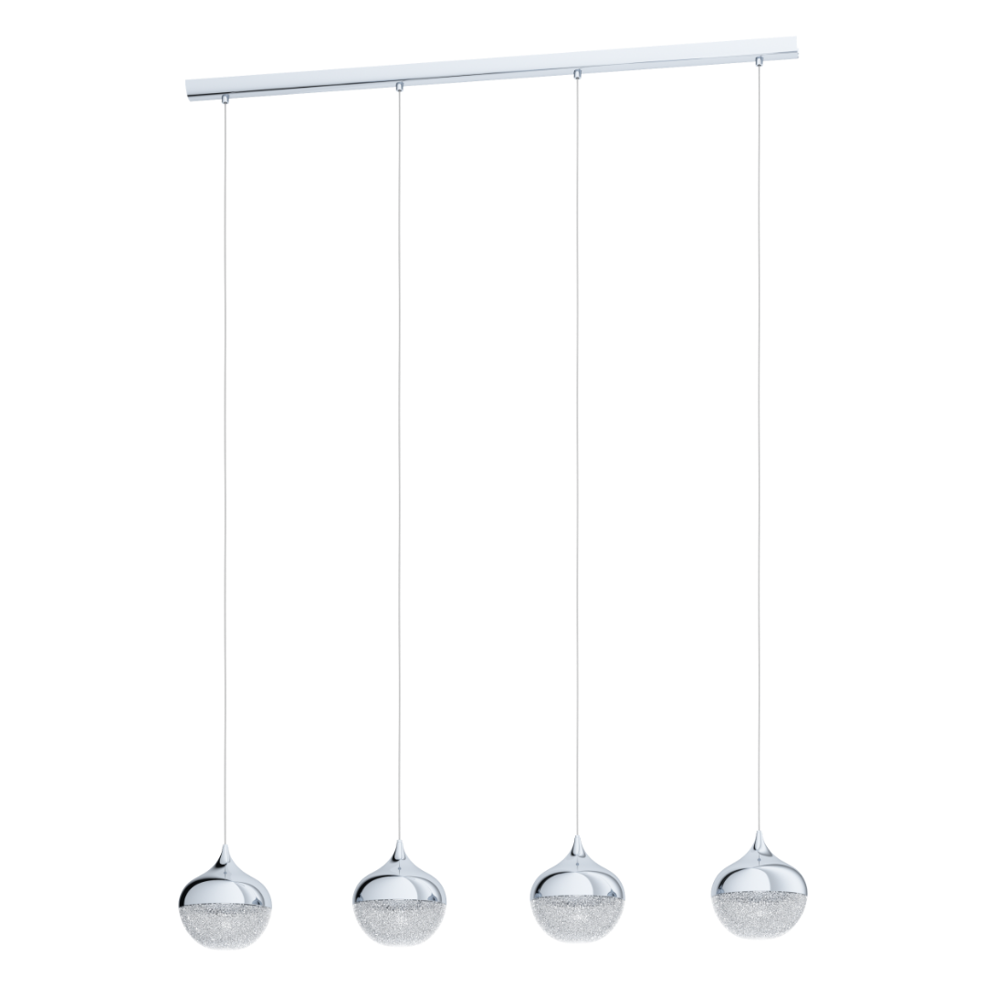 Een mooie hanglamp uit de lighting collectie van Eglo. De lamp is gemaakt van staal en kunststof met korrelvormig patroon en heeft de kleuren wit, chroom en helder. De lamp wordt geleverd exclusief lichtbron en is geschikt voor een wattage van maximaal 4x 25W. De lamp heeft een mooie kleur en opvallende kenmerken waardoor het een echte eyecatcher is. De lamp kan goed geplaatst worden boven de eettafel.