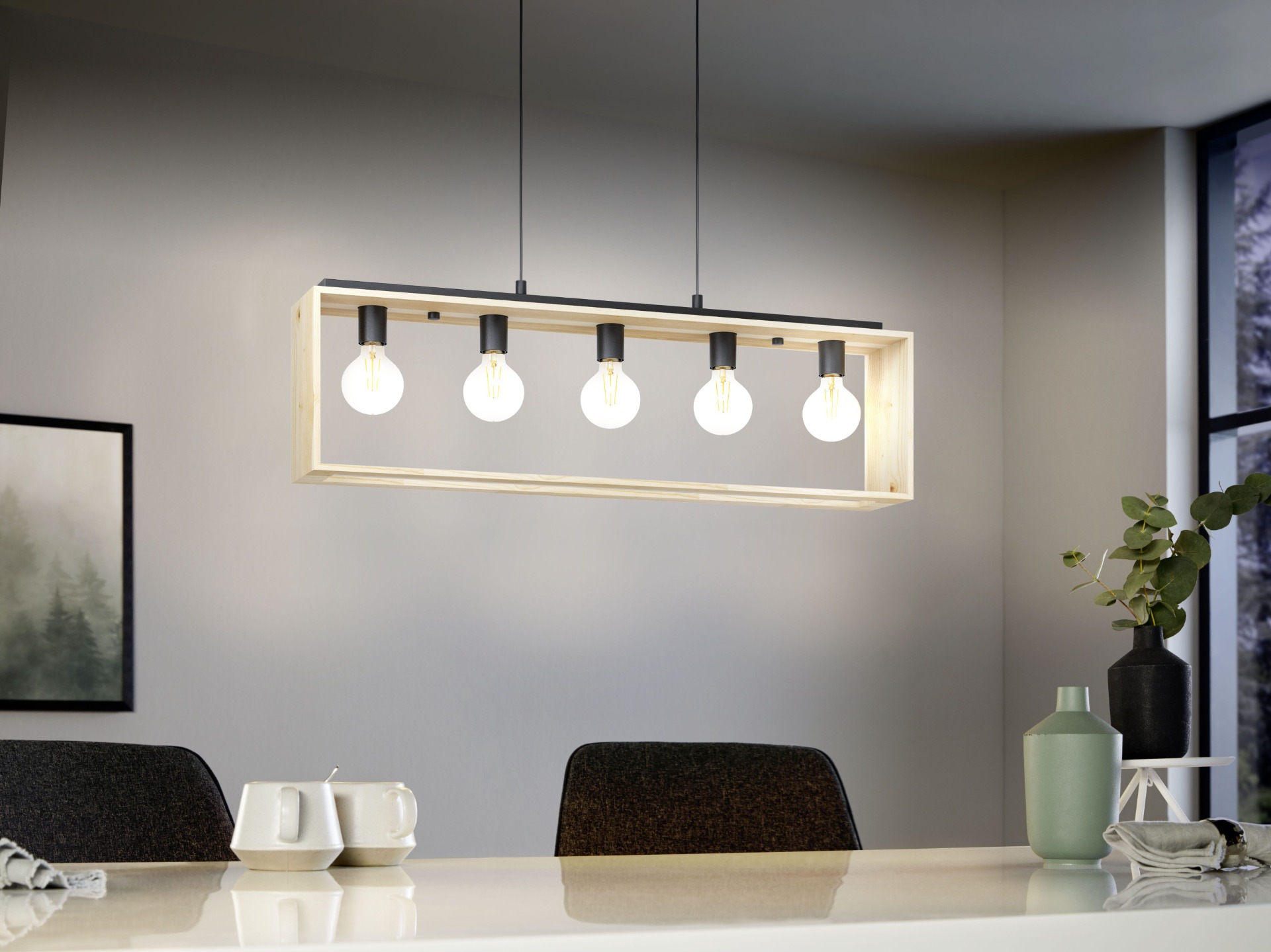 Een hanglamp uit de collectie van Eglo met een vintage / landelijke uitstraling. De lamp is gemaakt van staal en hout en heeft de twee kleuren zwart en natuurbruin. Door deze contrasten is de lamp een echte eyecatcher, maar geeft hij toch een rustige uitstraling. Deze lamp is een mooi voorbeeld van een lamp die je in de eetkamer kan hangen boven een eettafel. De lamp wordt exclusief lichtbron geleverd en is geschikt voor een wattage van max. 5x 40W.