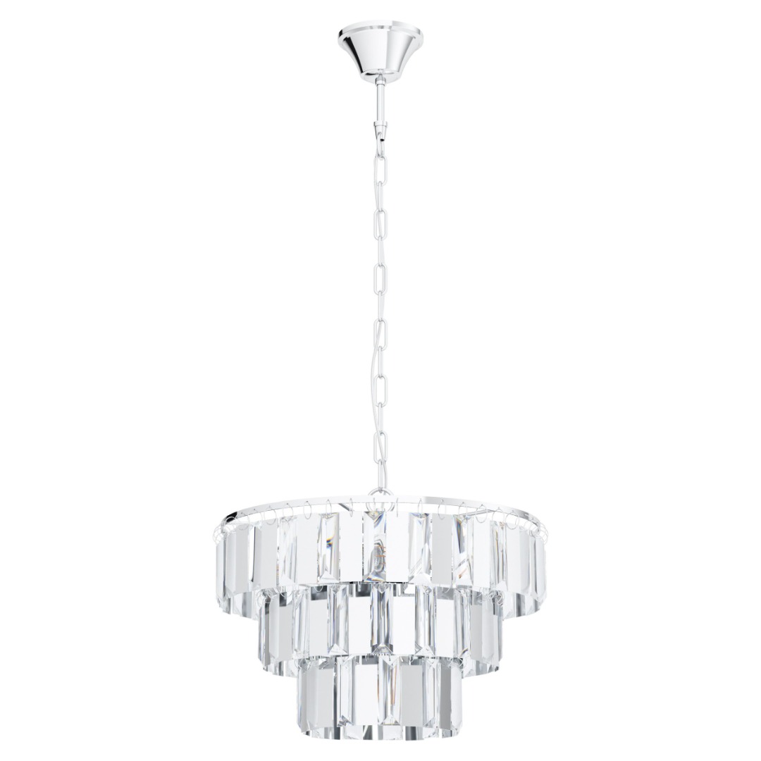 Een hanglamp uit de collectie van Eglo met een klassiek moderne uitstraling. De lamp is gemaakt van staal en kristal in de kleuren chroom en helder. Deze lamp is mooi voor boven de eettafel.  De lamp heeft meerdere E14-fittingen, en wordt zonder lichtbronnen geleverd geschikt voor een wattage van max. 5x 40W.