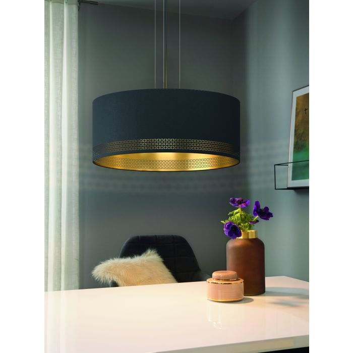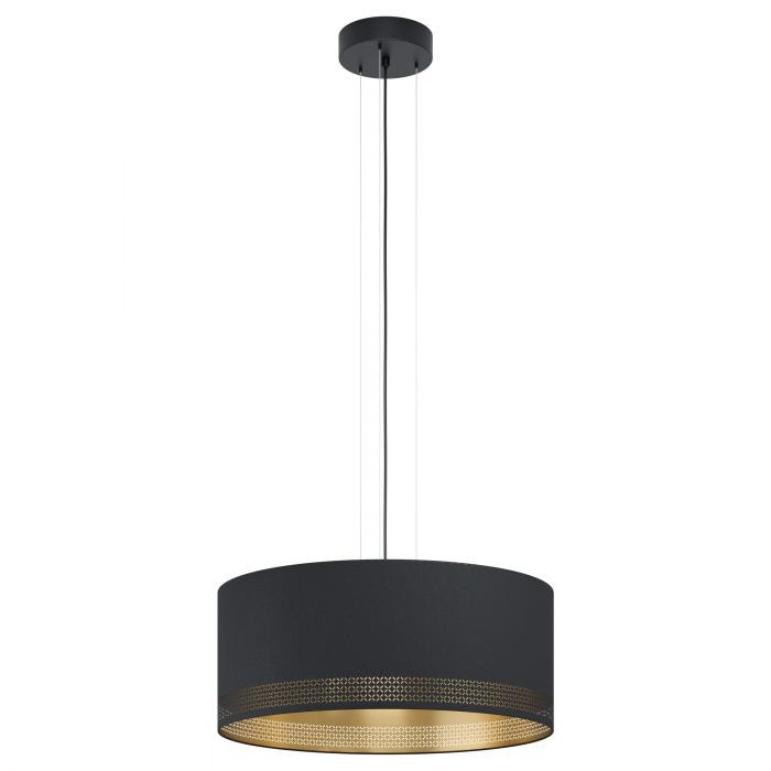 Een trendy lamp uit de hanglampen collectie van Eglo. De lamp is van zwart/goud-kleurig textiel gemaakt met een stalen behuizing. De lamp is een pareltje voor in uw woon- of slaapkamer. De Esteperra 99274 met een E27 fitting wordt exclusief lichtbron geleverd en heeft een maximaal vermogen van 1 x 40 Watt.