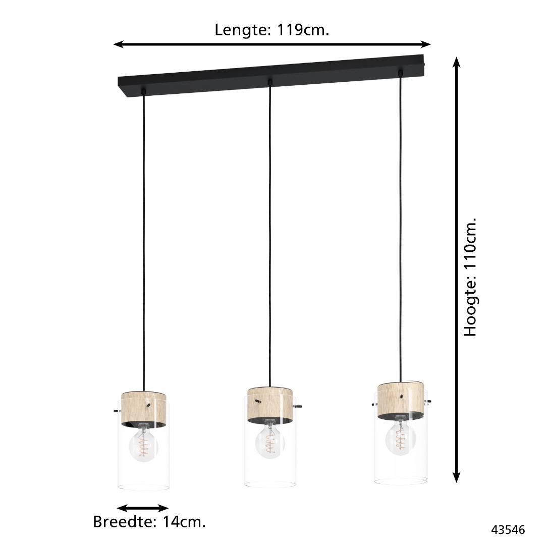 Een moderne hanglamp uit de lighting collectie van Eglo. De lamp is gemaakt van staal, hout en glas met een zwarte en bruine kleur met een helder glas. De lamp heeft E27-fittingen en wordt exclusief lichtbronnen geleverd. Het is geschikt voor een max. wattage van 3x 28W. De lamp heeft een bijzondere vorm, waardoor het een mooie, unieke uitstraling geeft aan je huis. De lamp is een goed voorbeeld van een lamp die mooi boven de eettafel kan worden opgehangen.