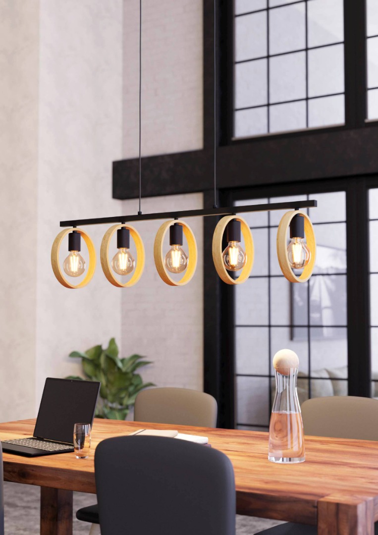 Een moderne hanglamp uit de lighting collectie van Eglo. De lamp is gemaakt van staal en hout met een zwarte en bruine kleur. De lamp heeft E27-fittingen en wordt exclusief lichtbronnen geleverd. Het is geschikt voor een max. wattage van 5x 40W. De lamp heeft een bijzondere vorm, waardoor het een mooie, unieke uitstraling geeft aan je huis. De lamp is een goed voorbeeld van een lamp die mooi boven de eettafel kan worden opgehangen.