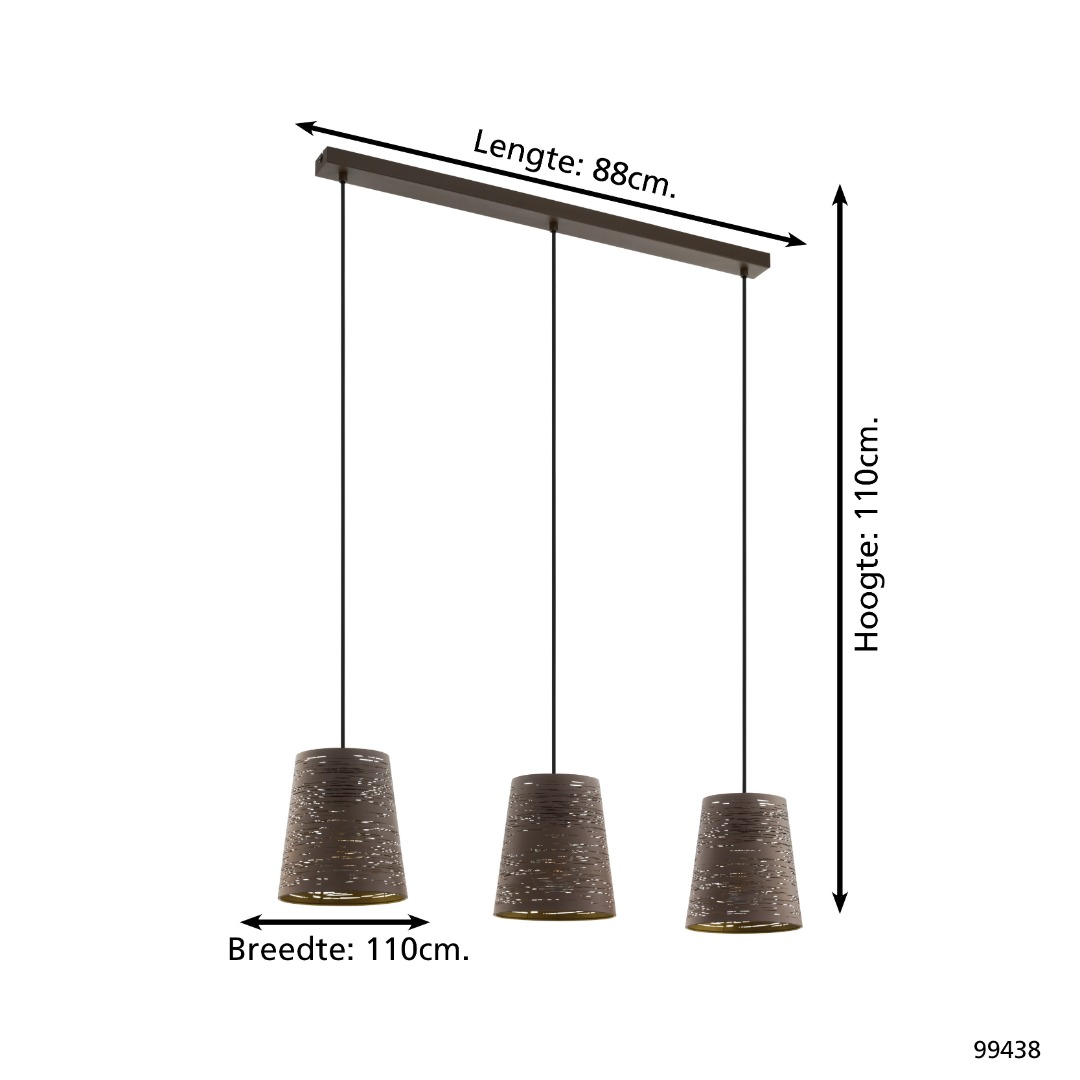 Een moderne hanglamp uit de hanglampen collectie van Eglo. De lamp is gemaakt van staal en heeft een mokka kleur met een gouden kleur aan de binnenkanten van de kappen. De lamp heeft E27-fittingen en wordt exclusief lichtbronnen geleverd. Het is geschikt voor een max. wattage van 3x 40W. De lamp heeft een bijzondere vorm, waardoor het een mooie, unieke uitstraling geeft aan je huis. De lamp is een goed voorbeeld van een lamp die mooi boven de eettafel kan worden opgehangen.