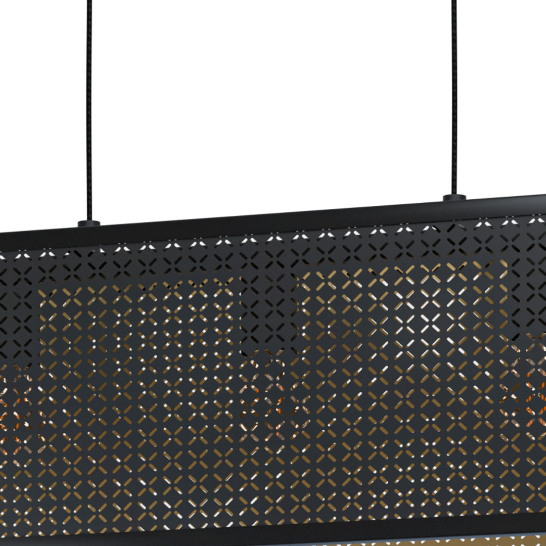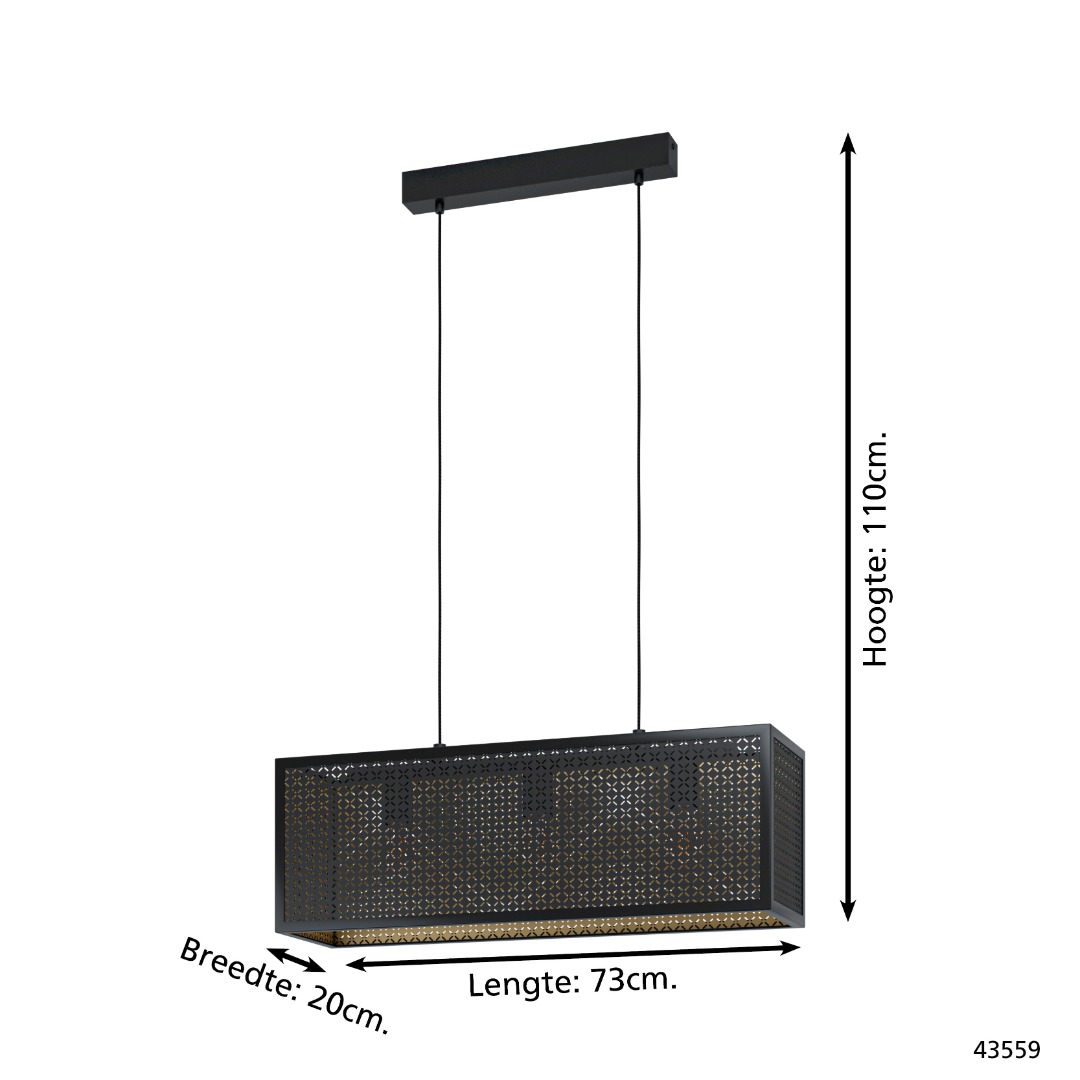 Een moderne hanglamp uit de lighting collectie van Eglo. De lamp is gemaakt van staal met een zwarte kleur en goud aan de binnenkant. De lamp heeft E27-fittingen en wordt exclusief lichtbronnen geleverd. Het is geschikt voor een max. wattage van 3x 40W. De lamp heeft een bijzondere vorm, waardoor het een mooie, unieke uitstraling geeft aan je huis. De lamp is een goed voorbeeld van een lamp die mooi boven de eettafel kan worden opgehangen.
